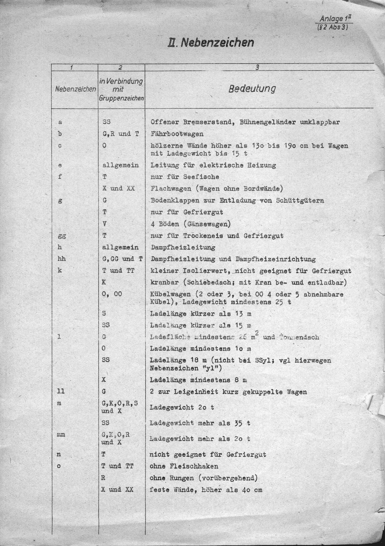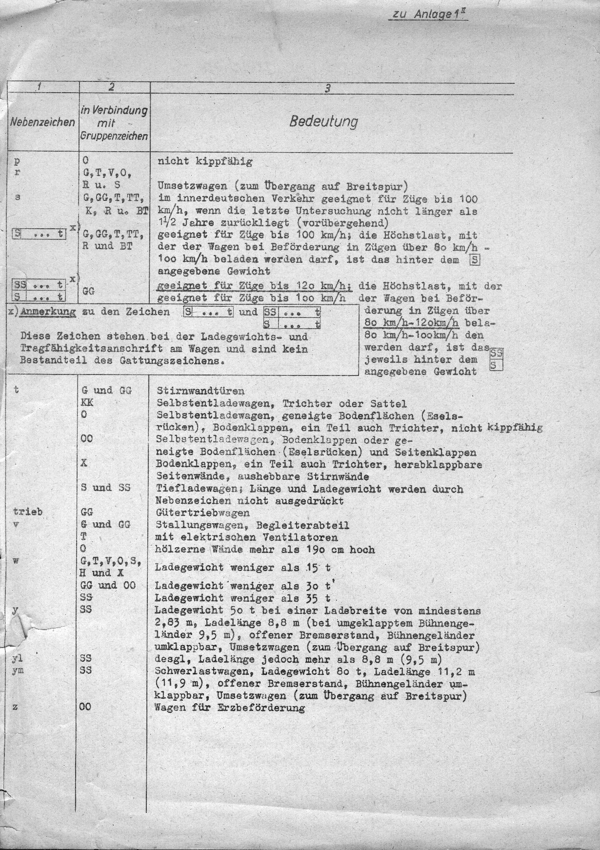 Die bisherigen Anlagen sind damit ungültig geworden. In der 3. Ausagbe der Anlage 5 ist bei den O- und OO-Wagen ohne Nebenzeichen des klareren Schriftbildes wegen der Abstand zwischen dem Gattungszeichen und der Bauart-Nummer auf 84 mm gegenüber 28 mm bei den O-Wagen mit Nebenzeichen (Om) erhöht worden.