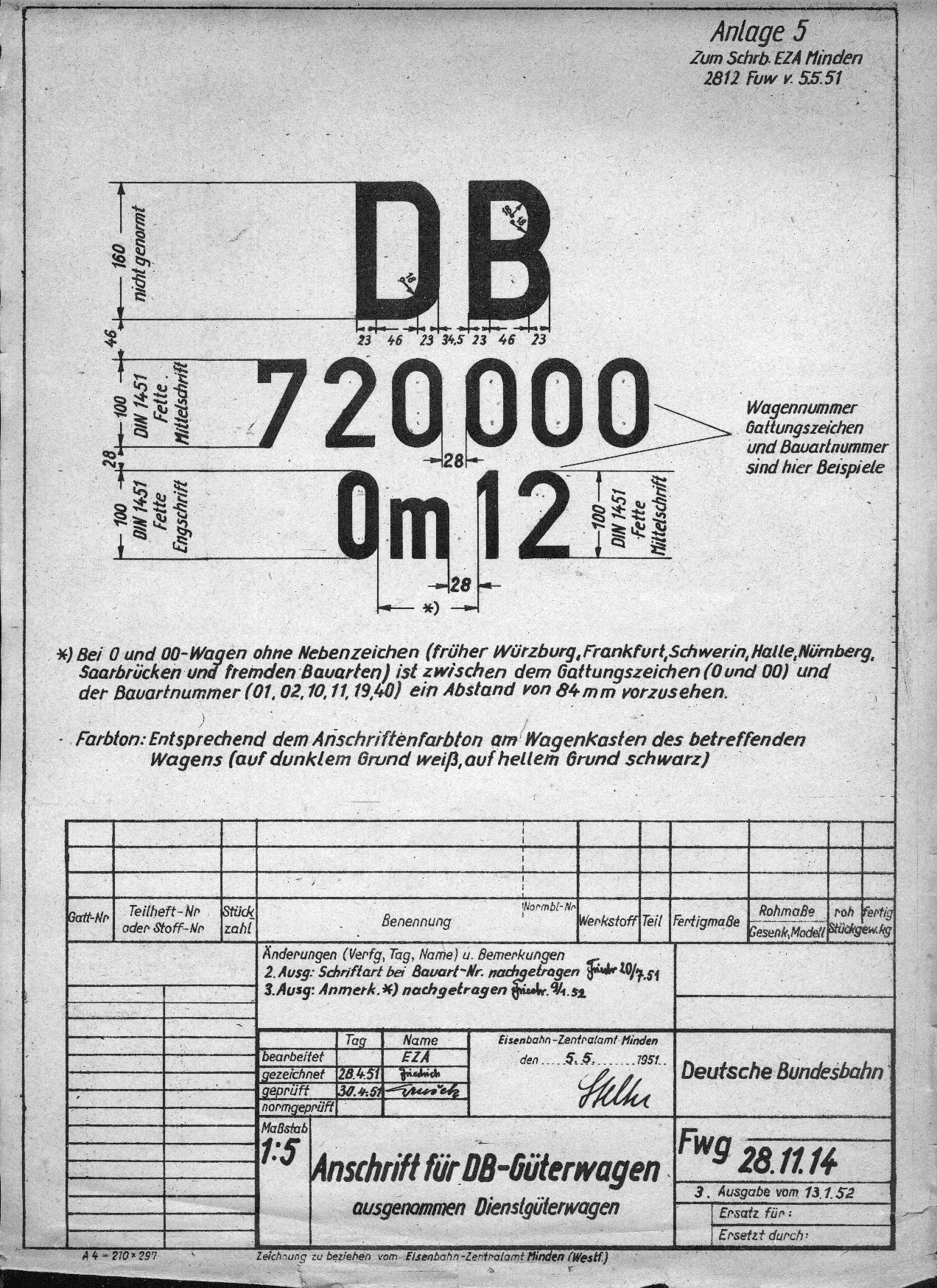 Die neue sechsstellige Wagennummer und die neue Bauartbezeichnung ist an den Seitenwänden entsprechend unserer Anlage 5 (Anschrift für DB-Güterwagen) zum Rundschreiben - 2812 Fuw 4/51 - vom 5.5.51 anzuschreiben. Wegen der Anordnung der Anschriften verweisen wir auf die Anlage 8 und 9 des gleichen Rundschreibens.