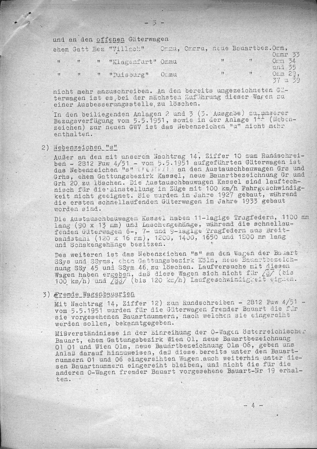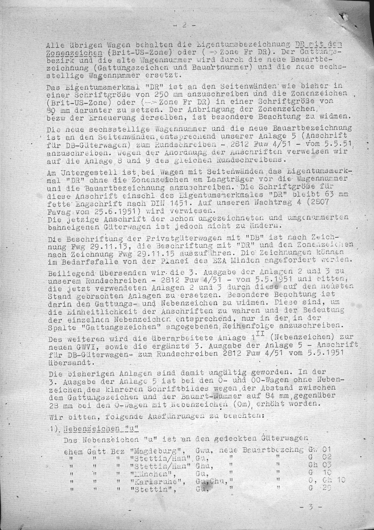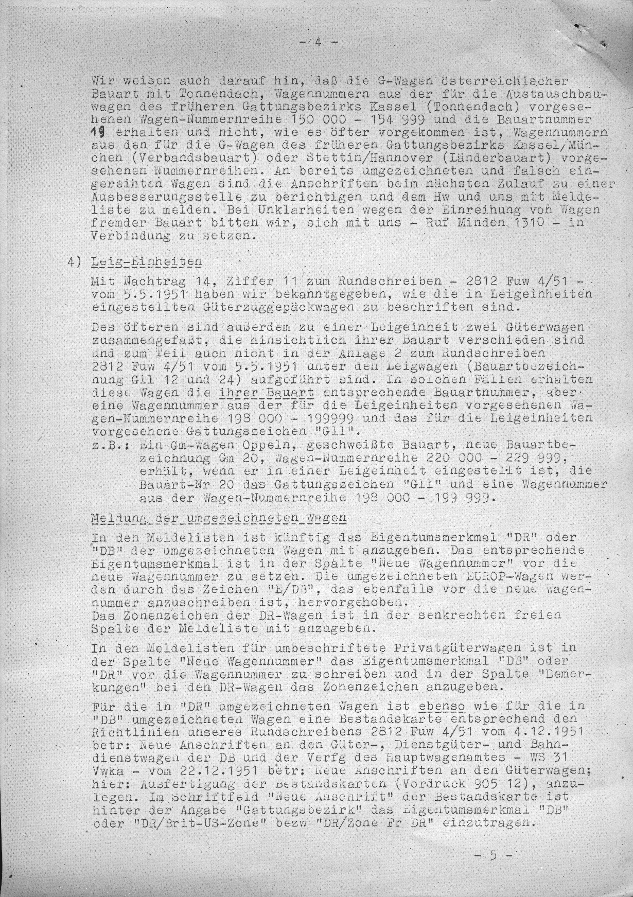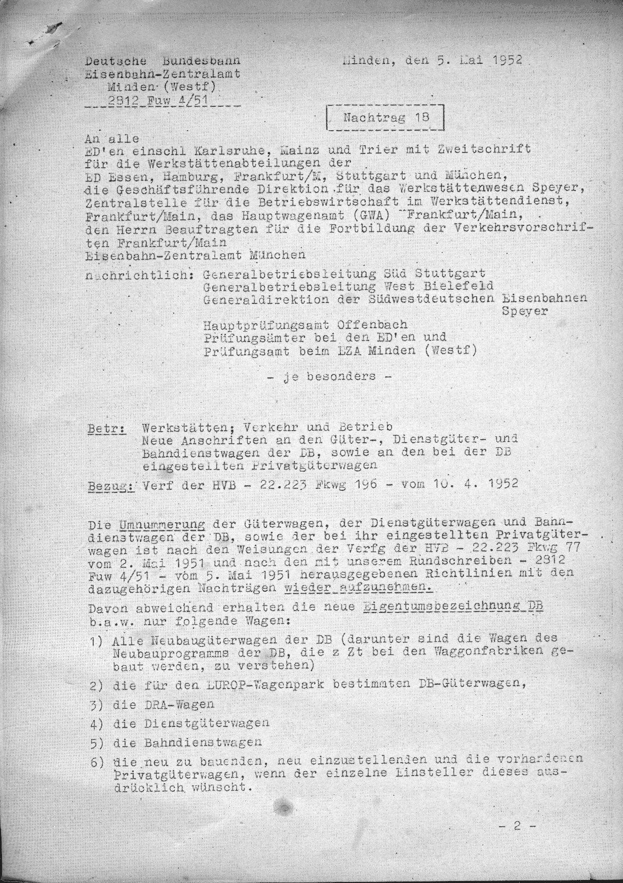 Die Umnummerung der Güterwagen, der Dienstgüterwagen und der Bahndienstwagen der DB, sowie der bei ihr eingestellten Privatgüterwagen ist nach den Weisungen der Verfg der HVB - 22.223 Fkwg 77 vom 2. Mai 1951 und nach den mit unserem Rundschreiben - 2812 Fuw 4/51 - vom 5. Mai 1951 herausgegebenen Richtlinien mit den dazugehörigen Nachträgen wieder aufzunehmen.