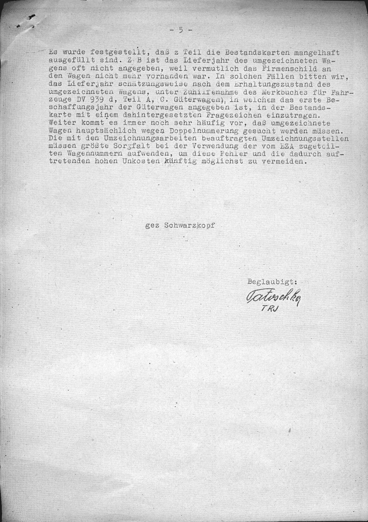 Es wurde festgestellt, daß z Teil die Bestandskarten mangelhaft ausgefüllt sind. Z B ist das Lieferjahr des umgezeichneten Wagens oft nicht angegeben, weil vermutlich das Firmenschild an den Wagen nicht mehr vorhanden war. In solchen Fällen bitten wir, das Lieferjahr schätzungsweise nach dem Erhaltungszustand des umgezeichneten Wagens, unter Zuhilfenahme des Merkbuches für Fahrzeuge DV 939 d, Teil A, (C. Güterwagen), in welchem das erste Beschaffungsjahr der Güterwagen angegeben ist, in der Bestandskarte mit einem dahintergesetzten Fragezeichen einzutragen. Weiter kommt es immer noch sehr häufig vor, daß umgezeichnete Wagen hauptsächlich wegen Doppelnummerung gesucht werden müssen. Die mit den Umzeichnungsarbeiten beauftragten Umzeichnungsstellen müssen größte Sorgfalt bei der Verwendung der vom EZA zugeteilten Wagennummern aufwenden, um diese Fehler und die dadurch auftretenden hohen Unkosten künftig möglichst zu vermeiden.