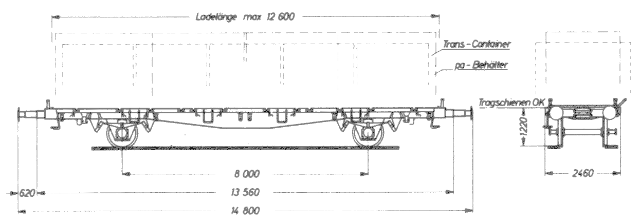 Wagen mit Langhubstoßdämpfer für pa-Behälter und Transcontainer.