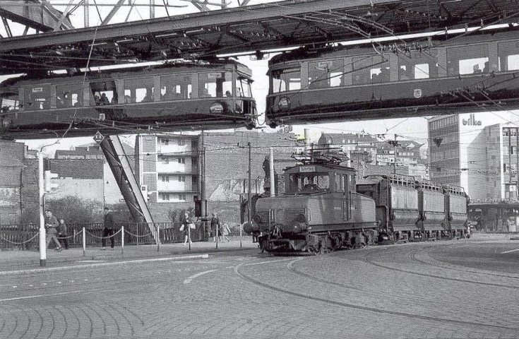 plus Kohlenzug auf der Rathausbrücke (Schwebebahnhaltestelle Alter Markt).