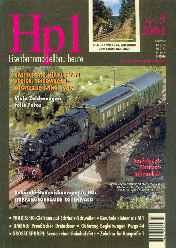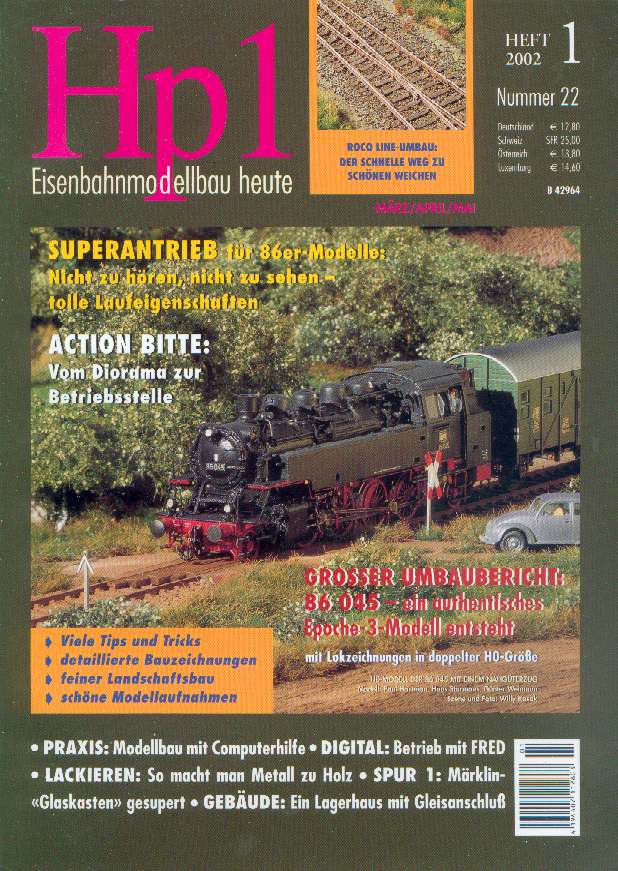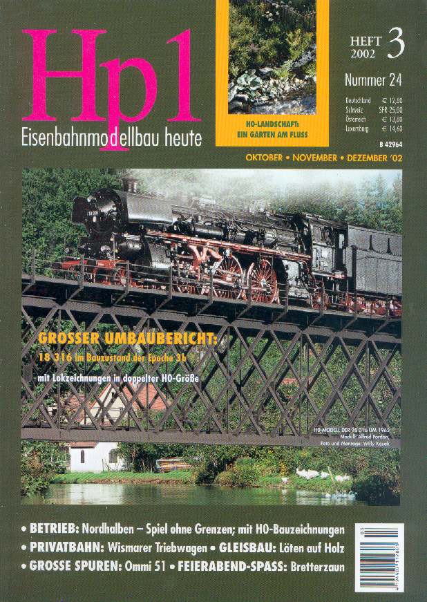 Die Titelstory ist der 18 316 gewidmet, jener Meßlok der Versuchsanstalt Minden. Folge 1 bringt Zeichnungen und Fotos sowie den Umbau des Tenders. Praxisnäher und typisch Hp1: Ausführliche Produktbesprechungen von Faltenbalgen und Übergangsgittern, die auch in Kurven für ein geschlossenes Zugbild sorgen. Warum berichtet da sonst keiner drüber? Schmalspur vom Feinsten: den Wismarer Triebwagen der Rhein-Sieg-Eisenbahn sind zahlreiche Vorbildfotos und Modellumbauten gewidmet. Der Nordenhalben-Artikel wird fortgesetzt, und auch der Ommi 51 erscheint ein weiteres Mal, diesmal als Selbstbau in Spur 2 und Kleinserie in Spur 1. Der Gleisbau dreht sich diesmal um das Löten auf Holz mittels Hohlnieten. Auch der Vorsignal-Artikel geht weiter. Ebenfalls typisch Hp1: daß man einer unscheinbaren Pflanze wie dem wilden Rhabarber oder auch einem schlchten Bretterzaun genausoviel Raum widmet wie mancher Lok. Verdientermaßen!