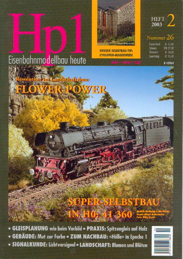 Schon wieder Hauptbahn: Titellok ist die 41 360, im Modell aus drei Weinertbausätzen komponiert und wie üblich mit etlichen Fotos und Zeichnungen aller Seiten. Es folgt ein zehnseitiger Artikel über das Silhouette-Blumenprogramm, der schon ein wenig nach Werbung aussieht, wenn auch die Bilder klasse sind. Planen und Bauen wie beim Vorbild, sprich: Gleisplanung mit knackiger Mathematik, zeigt als Kontrast sehr hohen Anspruch an die Leser. Zur Erholung möge ein Höllentalbahn-Artikel mit vielen alten Fotos, Gebäudezeichnungen und Grafiken dienen. Gebäude-Praxis gibt's aber auch: Tips zur Farbgebung von Modellgebäuden anhand eines Resinbausatzes in Spur 1. Schön! Das Vorsignal-Epos ist inzwischen beim Lichtsignal angelangt, und zum Thema Nordenhalben gibt's einen Nachschlag zur Herstellung des dafür typischen Zyklopenmauerwerks.