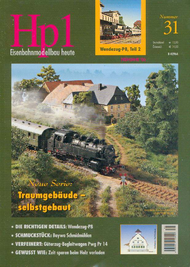 Nein, die P8 (übrigens von Gerard) auf dem Titel ist nicht die Titelstory, sondern die DKW 190-1:9 in H0pur, über die sie gerade fährt. Schöne Lokbilder gibt's aber trotzdem: 18 316 wird fertiggestellt. Ebenso eine Roco-V 80, deren Besonderheit, nicht-durchstoßende Federpuffer, auch diesseits von H0pur interessant sein dürfte. Den Gebäudefreaks gibt's Bilder und Zeichnungen des EG Thüste (Stahlfachwerk!) und des Lagerschuppens Salzhemmendorf. Mittlerweile Teil 4 der Vorsignal-Geschichte, aber langweilig wird's nicht. Etwas langatmig hingegen der Artikel über Viehtransportkisten im Spur-1-Modell, hier wäre weniger mehr gewesen. Wunderbar hingegen wieder diese Kleinzeug-am-Rande-Artikel über Weidezäune und Schiefermauern; auch die fahrbaren Rottenbuden sind lustig. Und Betrieb gibt's auch: Bedienung des Schotterwerks Heberndorf mit Schlüssel-Erlebnis in Form verschlossener Weichen.