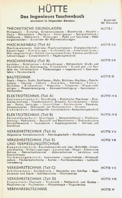Hier hat sich in den knapp 25 Jahren, die meine Exemplare umfassen, einiges getan. Das Vorwort zu Band I (27. Aufl.) nennt lediglich vier Bände: Band I, Theoretische Grundlagen; Band II, Maschinenbau; Band III, Bauingenieurwesen einschließlich Eisenbahntechnik; Band IV, Industrielle Technik und übrige Gebiete des Verkehrswesens. Die 28. Auflage ist auf sechs Bände in 11 Büchern angewachsen, deren Kurzinhaltsangabe hier als Scan zu finden ist. Hier scheinen sich die Nummern der Bände entsprechend verschoben zu haben; leider liegt mir keiner der Verkehrstechnik-Bände, weder der alte Band IV noch die neueren V A bis V D, vor. Die Inhalte der neueren Bände IV A und IV B, Elektrotechnik, waren zuvor Teil von Band II; der neuere Band VI, Verfahrenstechnik, kommt in den Inhaltsangaben der alten so nicht vor.