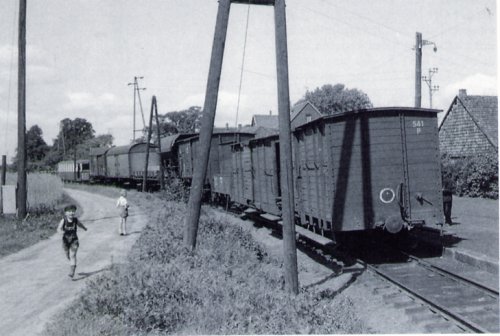 Bild 4: Eine beachtliche Last am Haken hatte der T 53 am 6.6.1964, hier in Großen Heidorn. Da staunte auch die Jugend, die heute vielleicht froh ist, noch die "gute alte Kleinbahn" miterlebt zu haben.