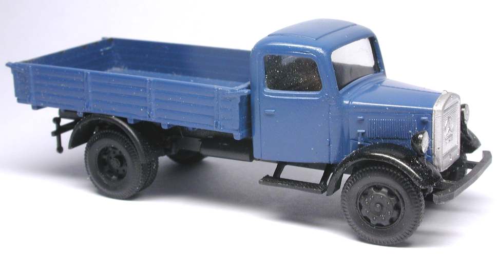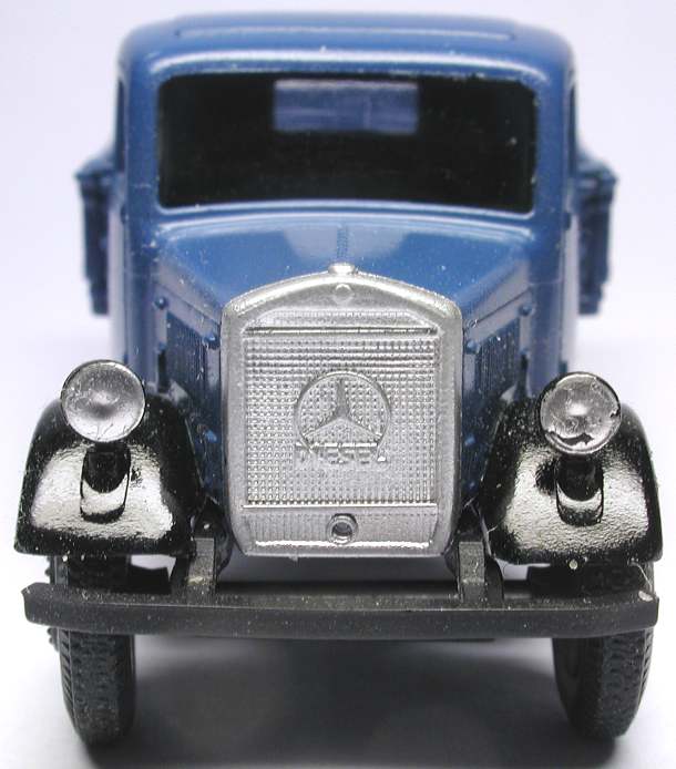 Allzu viel weiß ich nicht über diesen kleinen Laster. Sein Hersteller schreibt, das Vorbild sei in den Jahren 1940-42 entstanden; im Paulitz kommt nur ein Mercedes L 3000 S von 1939 als ex-Feuerwehrwagen vor, der eine andere, längere Haubenform hat, wie auch diverse im Web gefundene ex-Wehrmachts-L 3000. Aber sei's drum, ein niedliches kleines Lastwägelchen ist er allemal, und daß er ein Vorbild hat, glaube ich ohne weiteres.