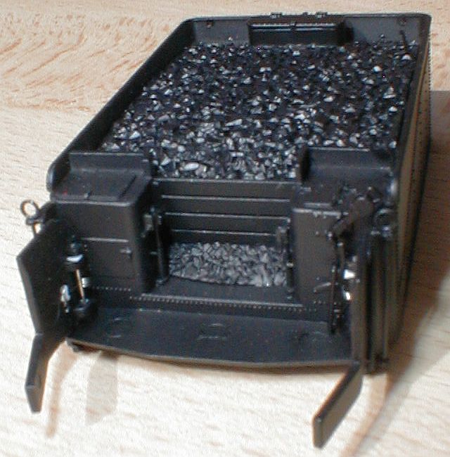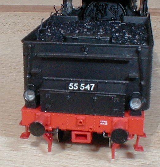 Der Tender ist ebenso gut detailliert, selbst die drei Halterungen für Schürhaken und Schaufel auf der Heizerseite sind nachgebildet. Der Kohleeinsatz mit leichtem Glanz imitiert Kohle ganz gut. Die Laternen sind ebenfalls freistehend nachgebildet und trotz der eingesetzten LED noch recht fein geraten. Der Tender hat ebenfalls weiche Federpuffer.