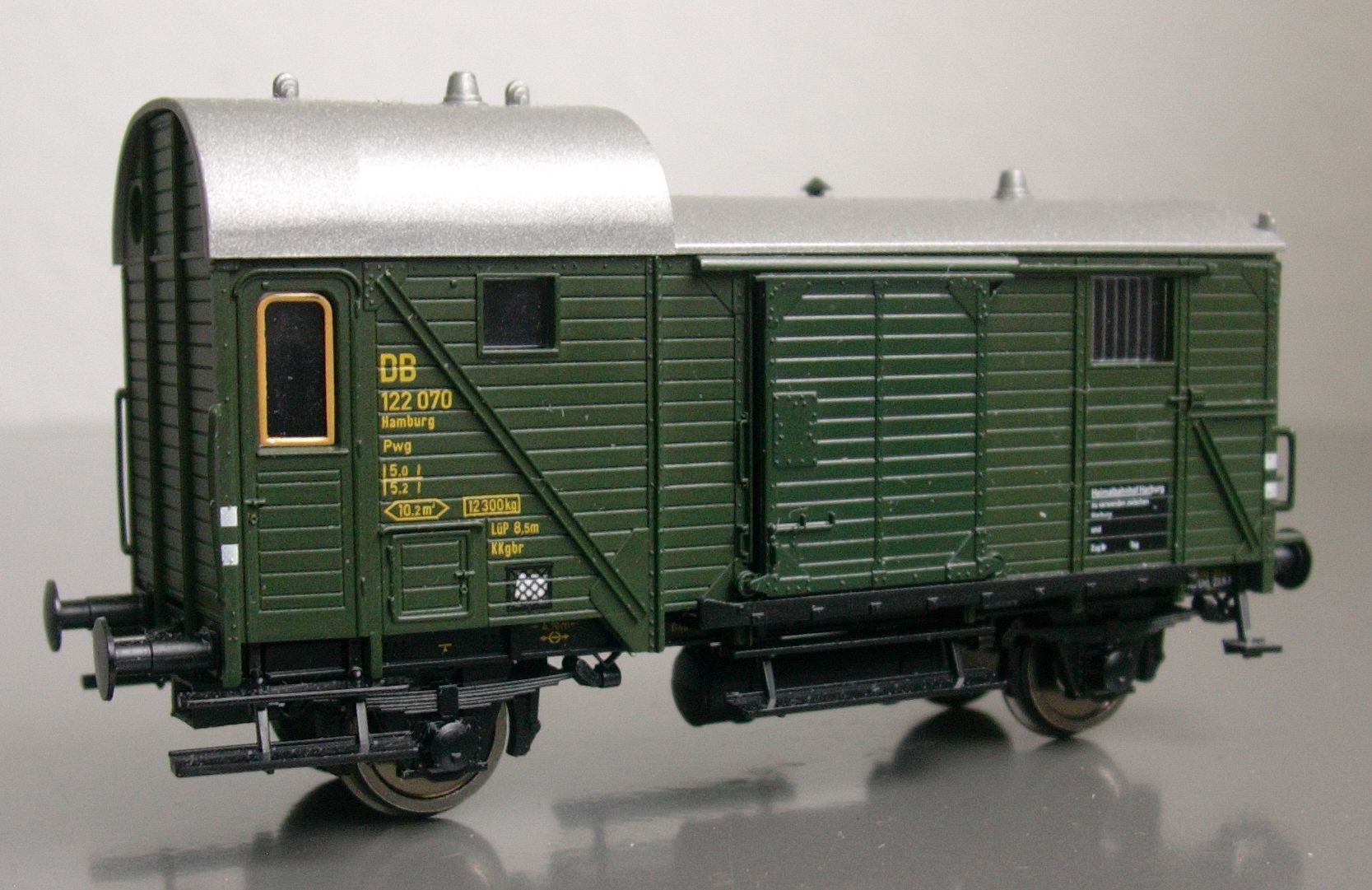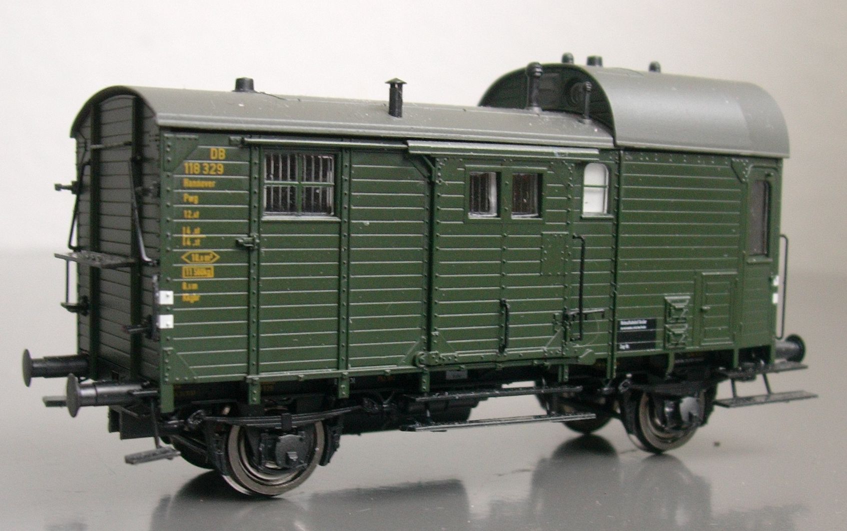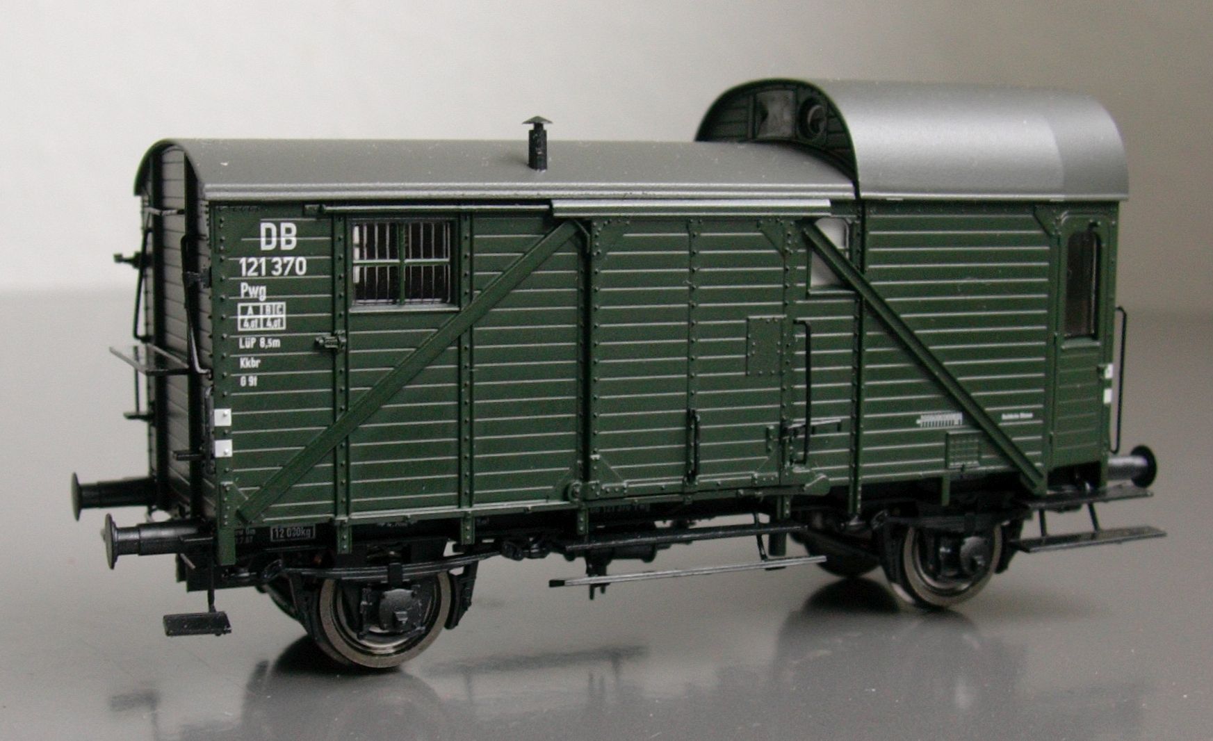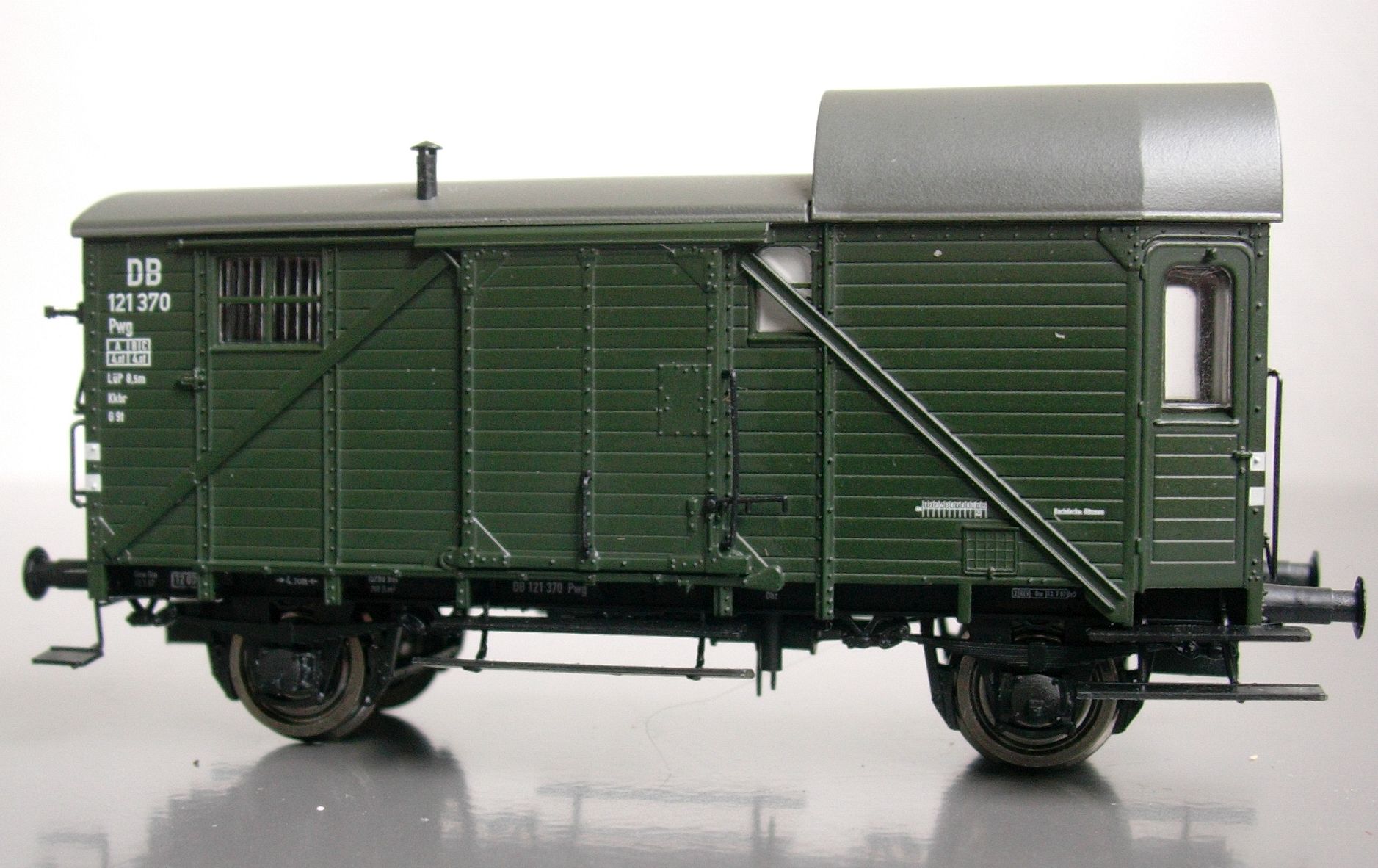 Um die genannten Varianten soll es aber in dieser Besprechung nicht gehen, sondern quasi um die dazwischen. Brawa hat nämlich vom Pwg 14 höchst löblicherweise gleich vier Formvarianten gemacht: außer der verstärkten Version der DB aus den 50er Jahren auch die Ursprungsversion mit durchgehenden seitlichen Tritten und Griffen -- und eben die abgebildete, wie sie in den 40er und frühen 50er Jahren entstand: zwar schon ohne die durchgehenden Tritte und Griffe der Urversion, aber auch noch ohne Verstärkungsstreben, einmal mit Gasbeleuchtung, Werkzeugschranktüren und Preßkohlenheizung sowie einmal mit elektrischer Beleuchtung und ohne Einbauten in der unteren Seitenwänden des Zugführerabteils.