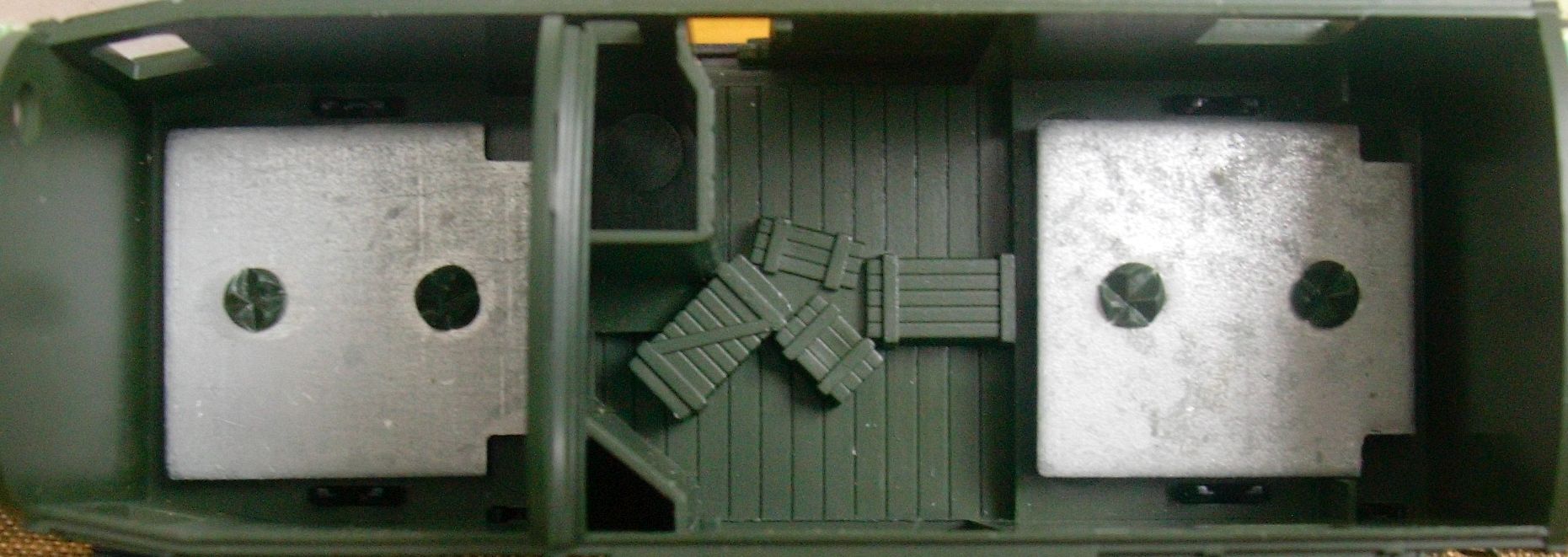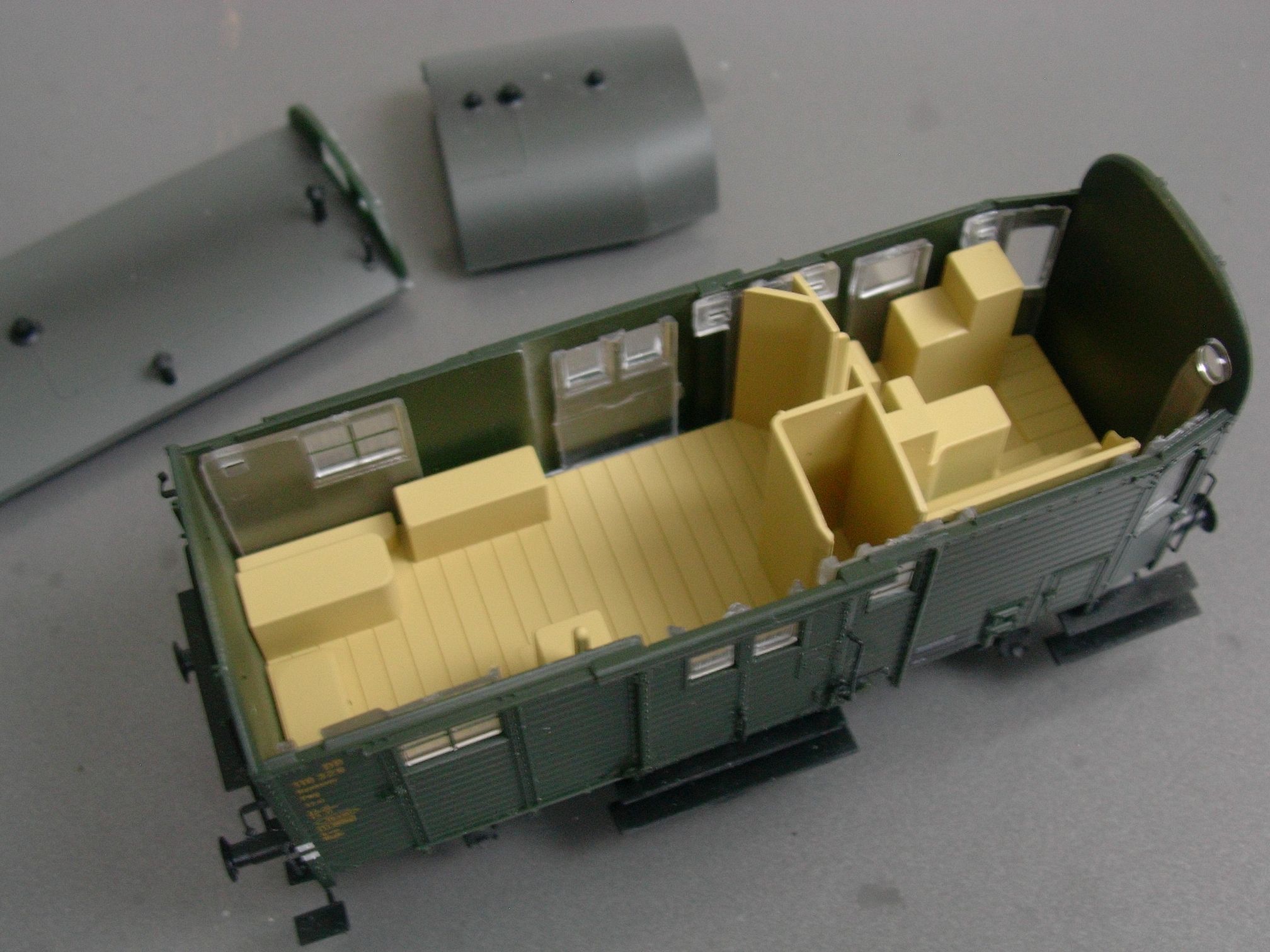 Die angedeutete Inneneinrichtung des Brawa-Modells ist indes wegen dessen permanent geschlossenen Schiebetüren auch schon viel mehr als genug: man sieht davon bei aufgesetztem Dach nur durch die Einstiegstüren am Dienstraumende etwas, nämlich je eine hellbeige Wand unmittelbar neben der Tür. Diese beim GFN-Modell auch einzubauen, scheint also sinnvoll, ebenso wie das Streichen der Innenwände beider Modelle -- den Dienstraum in einem Beigeton, Fußböden und bei Brawa die Polster ebenso wie, wenn man denn mag, den kompletten Packraum in Dunkelgrau; vom werkseitigen Dunkelgrün wird man das bei geschlossenen Schiebetüren aber eh nicht unterscheiden können. Die nach Vorbild-Innenaufnahmen ebenfalls mögliche helle Lackierung der Packraumwände ist zumindest beim GFN-Modell nur anzuraten, wenn man entweder die Schiebetüren zuklebt oder den Wagenboden nebst Zwischenwand überarbeitet.
