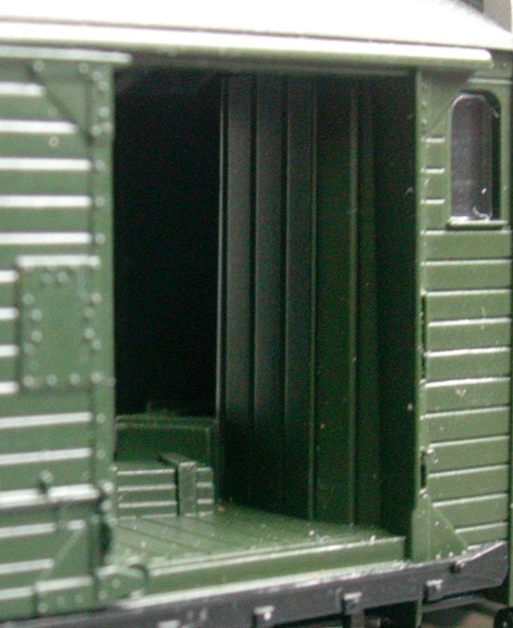 In einem Punkt aber ist das GFN-Modell sogar überlegen: bei der zu öffnenden Schiebetür. Normalerweise lege ich ja keinen Wert auf derlei Spielfunktionen, aber es gibt Ausnahmen: bei gedeckten Güterwagen ist eine offene Schiebetür zur Darstellung sommerlicher Großviehtransporte mit Einsatzgatter hilfreich, und bei Pwg eben für die gar nicht so selten auf Vorbildfotos zu sehende Belüftung des dann ja doch eher stickigen Wageninneren während der Fahrt.