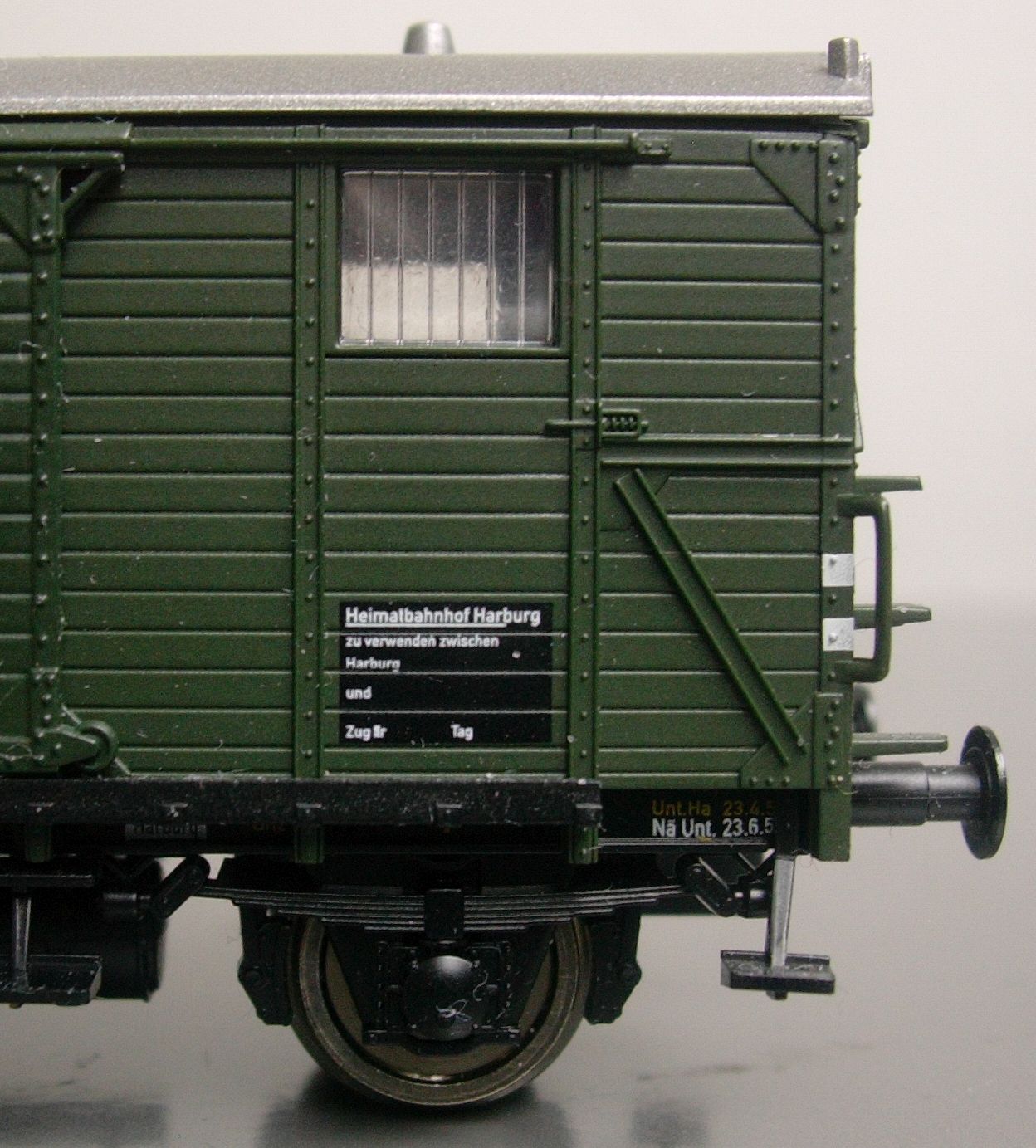 Leider sind die Innenwände zudem wie die Wagenkasteninnenseite in der Wagenkasten-Außenfarbe gehalten, wodurch man immerhin das Fehlen jeglicher sonstigen Einrichtungsteile, Details oder Gravuren in der "dunklen Höhle" nicht sieht. Was man aber sehr deutlich sieht, sind ein paar "wüst hingeschmissene" Kisten zwecks Tarnung der Kurzkupplungsfeder in der Mitte des ohnehin zu hoch liegenden Packraumbodens sowie eine massive Stahlplatte an seinem stirnwandseitigen Ende. Eine weitere solche im Dienstraum bleibt bei montiertem Wagen unsichtbar; das ganze Elend offenbart die