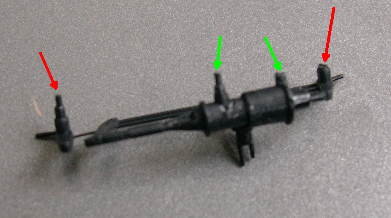 Bild D4 zeigt, daß das bei mir nur halb geklappt hat, aber ein Zapfen ist immerhin erhalten geblieben. Grün markiert sind im Bild die Haltezapfen, die wir brauchen (der rechte ist abgebrochen). Die rot markierten Zapfen sind beim Pwg pr 14 überflüssig und hängen in der Luft.