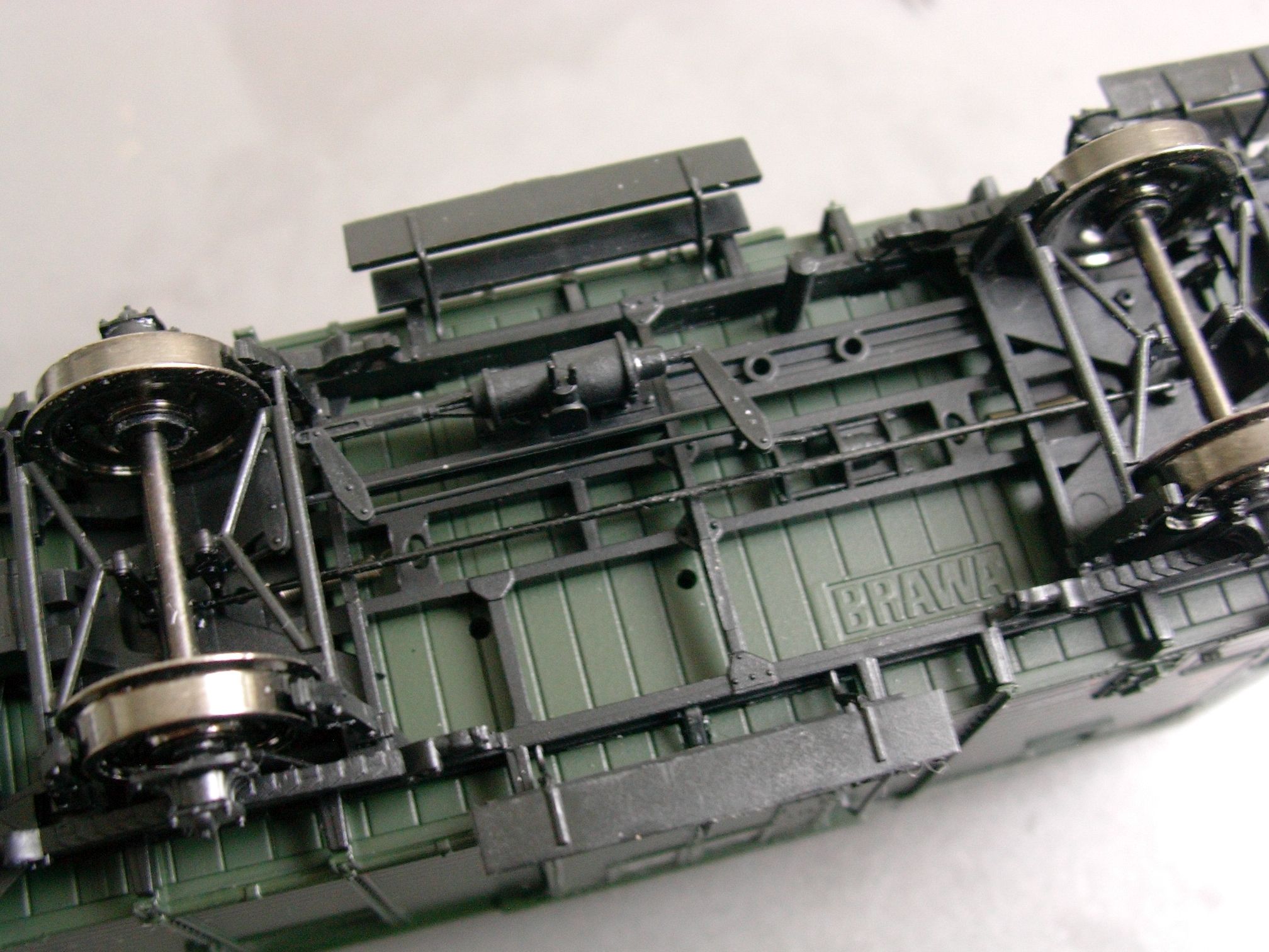 Bei Brawa ist die Bremsanlage einzeln angesetzt, was die Korrektur der Position erleichtert. Und nicht nur das: es befinden sich sogar Montagelöcher für die Bremse an der richtigen Stelle im Wagenboden! Das nebenstehende Bild D2 zeigt sie deutlich, rechts von der Wagenmitte und unterhalb des Abort-Fallrohrs.