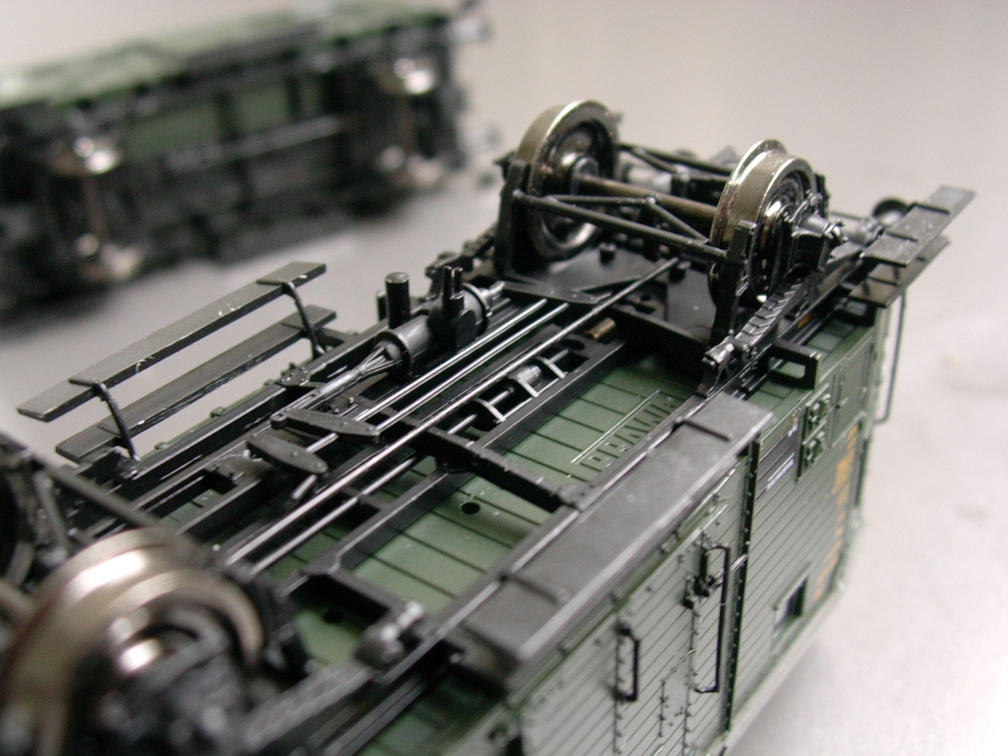Denn also rein mit dem Ding! Das nebenstehende Bild D5 zeigt die richtige Einbaulage: das "lange Ende" der Bremsanlage zeigt natürlich Richtung Wagenmitte, und dank des gekürzten Zapfens liegen alle drei Umlenkhebel schön parallel zum Wagenboden, wie sich das gehört. Die im Gegensatz zur Wbr nicht bis hinter die Achshalter führenden Bremsgestänge sehen aus dieser Perspektive zugegebenermaßen etwas unfertig aus. Die Hundertprozentigen werden diese sicherlich verlängern bzw. durch längere Drähte ersetzen, ich hingegen hab es gut sein lassen, denn von der Seite sieht man das eh nicht. Wer mich kennt, wird nichts anderes erwartet haben.