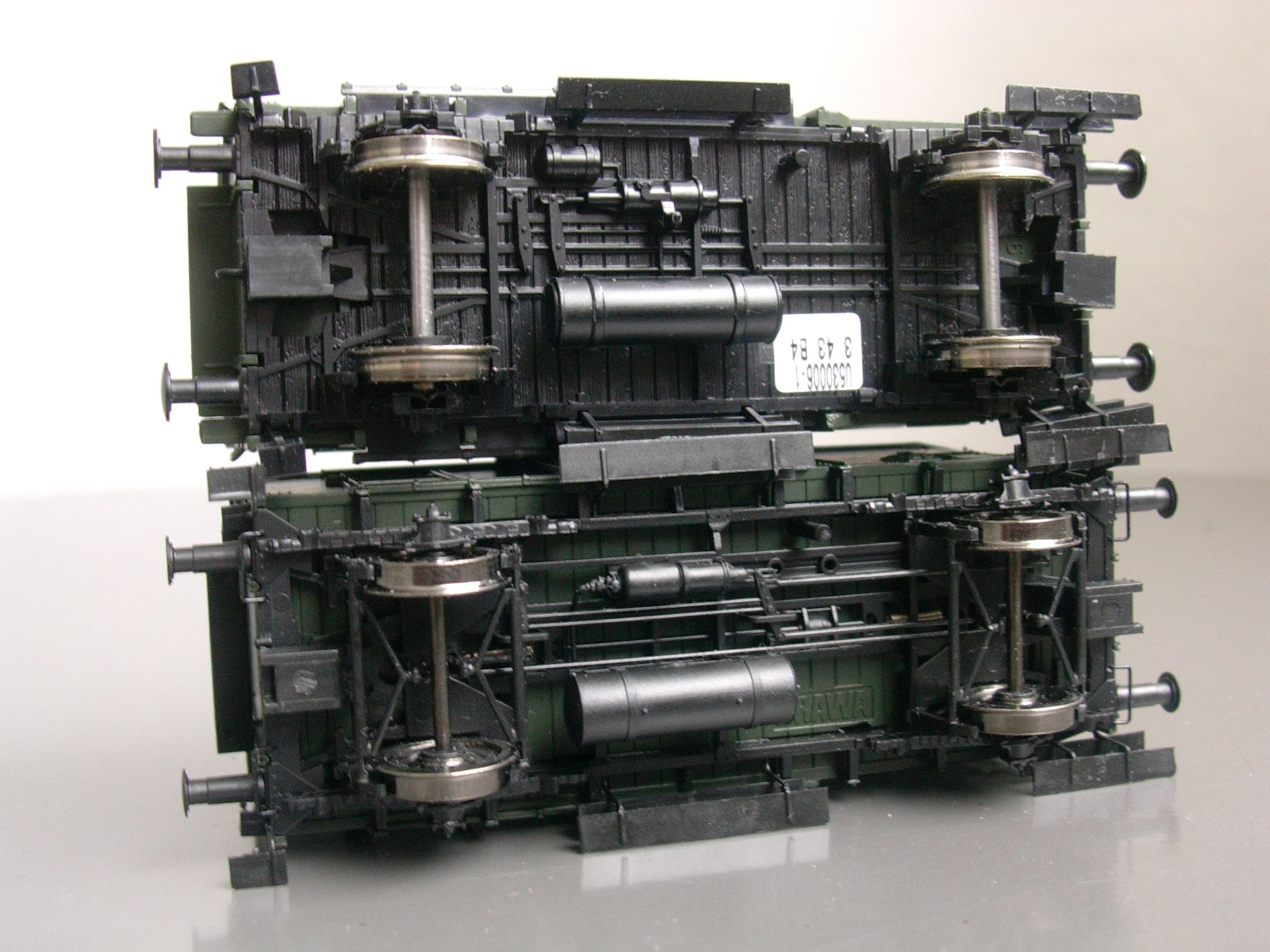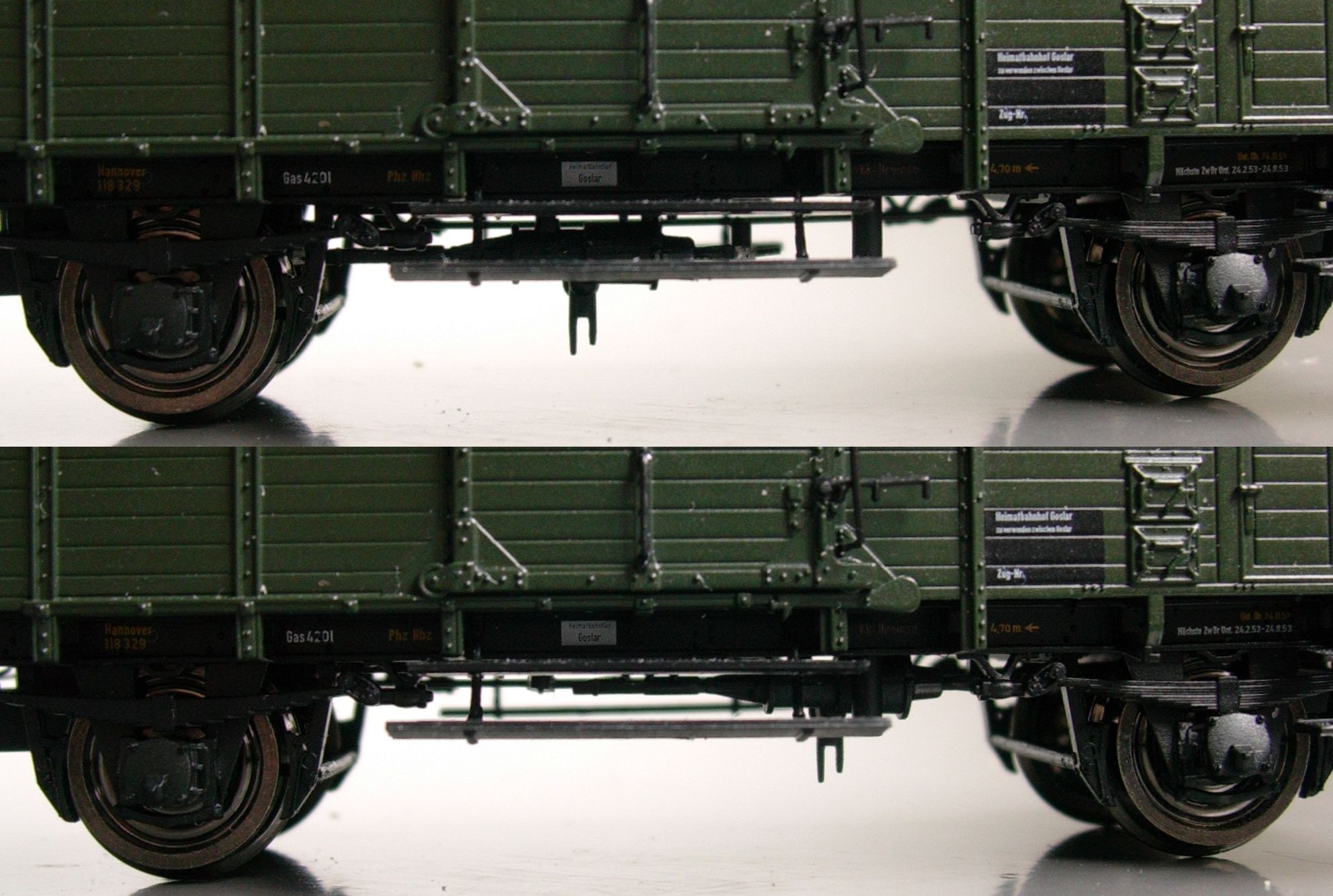 Wie im Abschnitt Fahrwerk erwähnt, sitzt bei beiden Modellherstellern die Nachbildung der Kunze-Knorr-Güterzugbremse (Kkgbr) an der falschen Stelle, nämlich ungefähr mittig unter der Schiebetür. Bei Brawa läßt sich das, wie im Folgenden gezeigt, leicht beheben; bei GFN wird die Säge sprechen müssen, und auch davon werde ich hier Bilder nachtragen, wenn ich es denn mal gemacht habe. Doch fangen wir mit dem einfacheren Teil an.