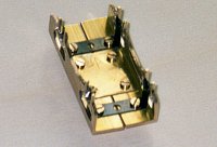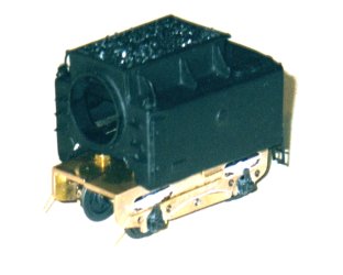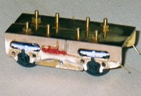 Das Grundgerüst entstand aus Messingwinkeln, die mit Laubsäge und Feile bearbeitet wurden. Die Radaufhängung habe ich aus einem Fleischmann-Güterwagen entnommen – ebenso die Räder. Die Aufhängungen wurden mit Schrauben an den Winkeln befestigt und zur besseren Stabilisierung des Gestelles wurde ein Messingblech mit vier Schrauben untergesetzt.