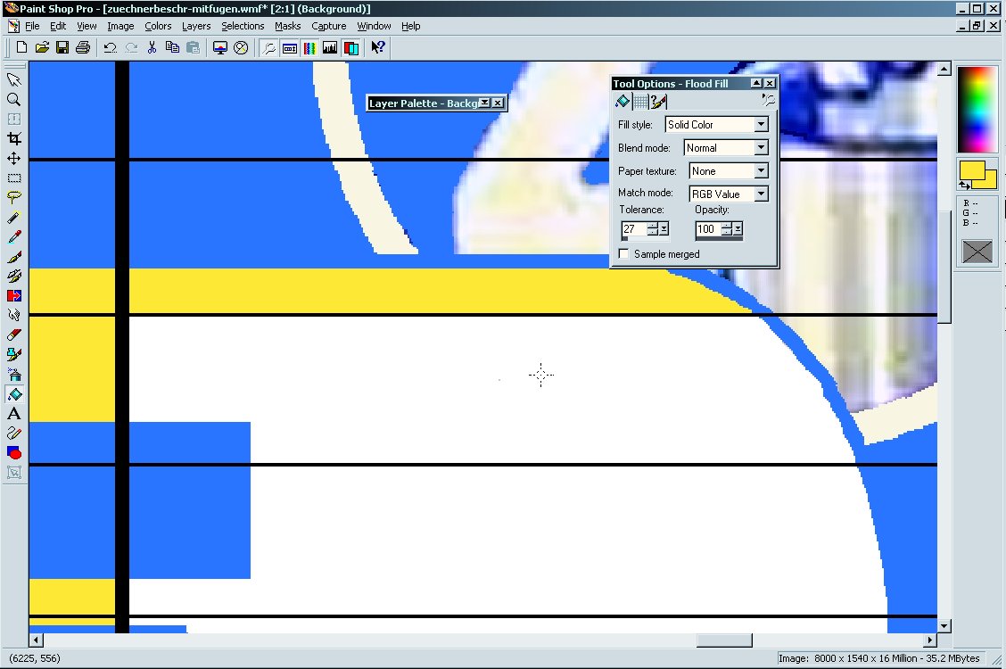 Bei meiner High-End-Software ;-) war das schon ein bißchen spannend, wie man das Bild dann vom Vektor- ins Pixelprogramm kriegen würde. Klar kann man aus Designer Bitmaps exportieren aber so ganz stimmig werden die leider nicht, egal wie groß man die Auflösung wählt. Das Designer-Format kann wieder Paint Shop Pro nicht lesen. Also Export in ein von PSP unterstütztes Vektorformat, in dem aber auch die Bitmaps mitexportiert werden müssen. Bewährt hat sich bei mir nach ein paar Fehlversuchen mit EPS und sowas das Format WMF, "Windows Meta File" oder sowas, jedenfalls von Microsoft und damit böse, aber verbreitet. Die so erstellte Datei liest PSP ohne Murren und fragt dabei, wie groß man sie denn wolle, in Pixeln.