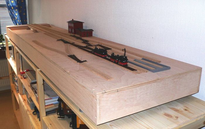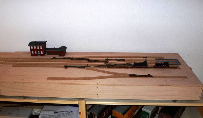 Jetzt ist alles "fertig" und funktioniert sogar. Natürlich muss das eine oder andere noch justiert und eingestellt werden. Insbesondere die Weichenantriebe erfordern noch Nacharbeit, da die gewählten Conrad Universalantriebe nicht gerade ein Muster an Zuverlässigkeit sind. So manch ein Antrieb "schnattert" noch, oder die Weichenzungen liegen nicht kräftig genug an, um mit "Saft" versorgt zu werden. Da kommt es noch vor, dass die Loks trotz genügend Dampfes im Kessel doch schon mal stehen beleiben.