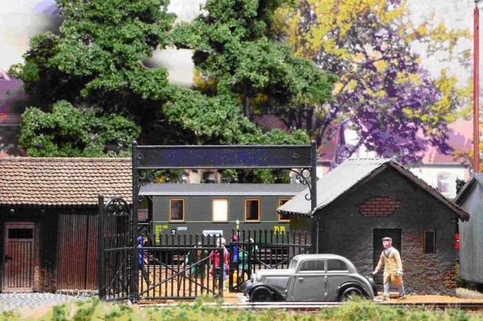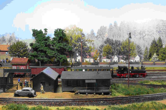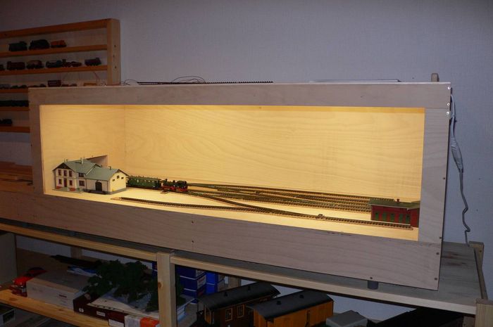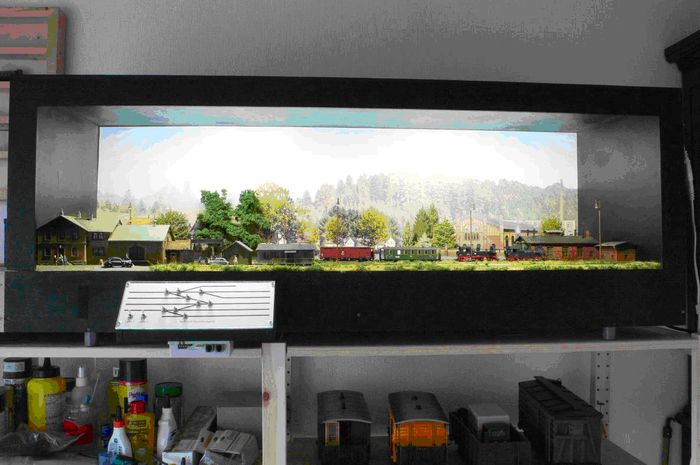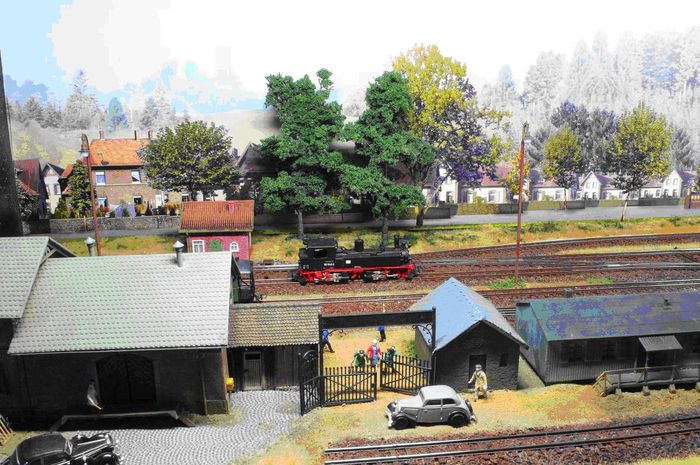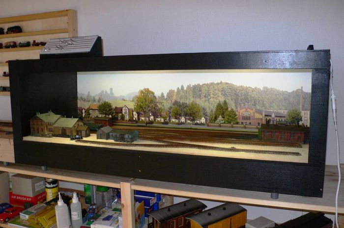 Lange habe ich mir den Kopf zerbrochen, wie ich den Hintergrund gestalten soll. Die Ideen gingen von einfach in Weiss lackieren oder ganz hellgrau? ...bis hin zu Airbrush Kunstwerken. Ich hab es jetzt mal mit einem Fertighintergrund von Busch probiert, wenn es nicht gefällt, ist es leicht geändert.