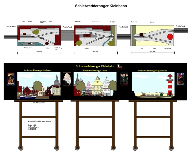 Ein englisches Sprichwort fordert einen auf, „außerhalb“ der Kiste zu denken, aber die Lösung der Aufgabe lag in der Kiste. Aus der Schietwedderooger wird eine Kistenbahn, die unterschiedliche Szenen des alten Konzeptes aufgreift und in einzelnen „Kisten“ darstellt, die durch Übergangsstücke miteinander verbunden werden. Jede Kiste ist für sich eine eigenen kleine Anlage und kann mit Ansatzstücken auch betrieben werden. Als Endausbaustufe sind 3 Kisten vorgesehen, es können aber auch mehr werden, wie gesagt, je nach Platzverhältnissen und Geldbeutel.