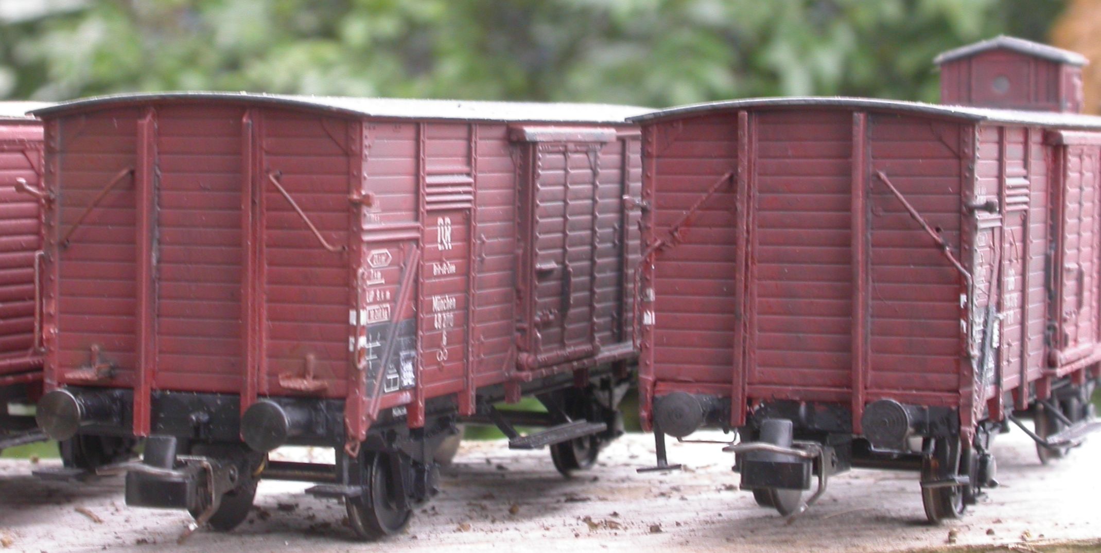 Ein weiteres Problemchen, das ich mit dem Brawa-G 10 habe, ist aber noch nicht zur Sprache gekommen: die sehen alle gleich aus! Soll heißen: Da es nichts weiter zuzurüsten oder zu supern gibt, beschränken sich die Leut beim Herrichten ihrer Brawa-Wagen aufs Umbauen der Kupplungen, das Umnummern und (wenn man Glück hat) die Alterung. G 10 waren aber beim Vorbild, wie alle preußischen Wagen, ziemlich variantenreich, gerade was die Anordnung der Griffstangen angeht. Wenn man einen Märklin-Wagen herrichtet, ist es kein Mehraufwand, diese Varianten auch umzusetzen. Will man das auch beim Brawa-Wagen tun, ist das nicht viel weniger aufwendig, als einen Märklin-Wagen zu supern. Und auch weitergehende Umbauten wird man sich beim einfachen und preiswerteren Märklin-Wagen eher zutrauen, als ein teures Brawa-Supermodell unter die Fräse zu legen.