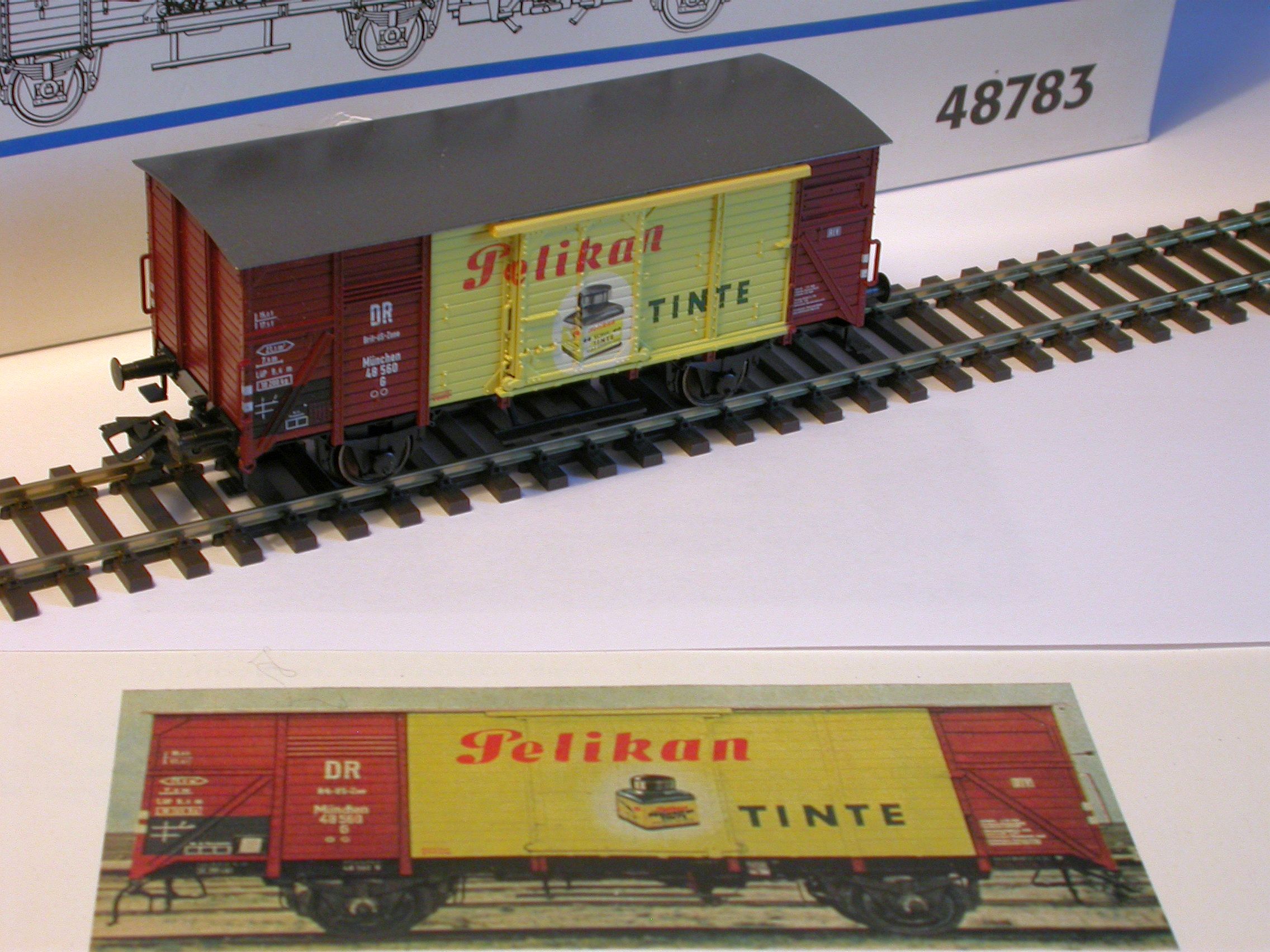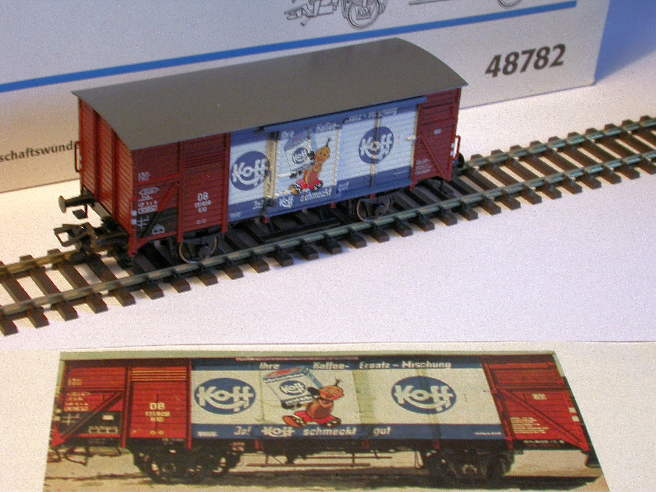 Mit "bunten" Werbe-Güterwagen sind wir ja reichlich versorgt, anscheinend verkaufen sie sich wirklich besser als die "langweiligen" braunen. Kostengünstig in der Entwicklung sind sie auch, und so kann kaum ein Hersteller widerstehen, auf diese Art ein paar Euro nebenher zu verdienen. Auch Märklin nicht.
