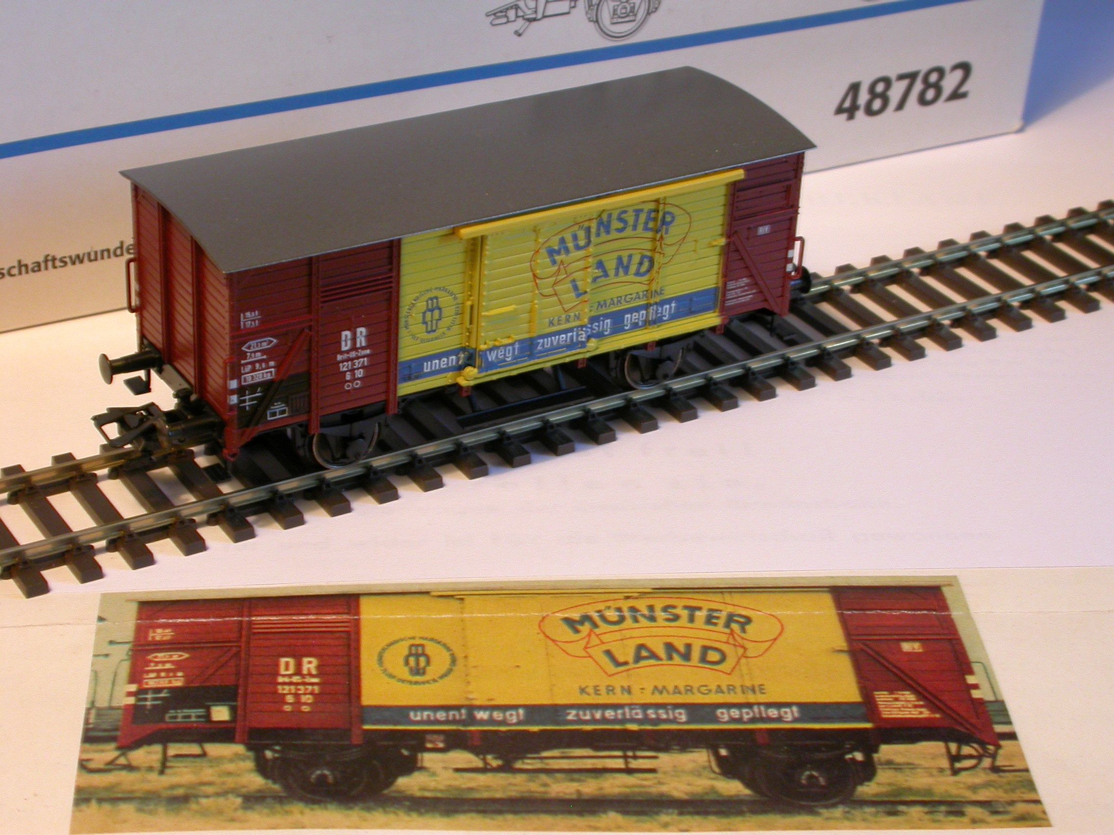 Aber nicht alles ist Phantasie. Auch bei Märklin nicht. Und damit wir ewigen Kritteler es auch glauben, hat Märklin der zweiten Packung "Wirtschaftswunder", No. 48783, ein Faksimile eines Prospektes der Firma "Deutsche Eisenbahn-Güterwagen-Reklame KG Fr. Albert Jentzsch" aus Berlin-Tempelhof beigelegt, der die Vorbilder der Wagen aus den Sets 48782 und 48783 als zeitgenössische Farbfotos zeigt, anscheinend schon damals der Fa. Märklin & Cie. G.m.b.H., Göppingen, übersandt und datiert vom 12.11.52. Das ist nicht nur ein interessantes Zeitdokument, sondern auch ein löblicher Service am Frokler! :-)
