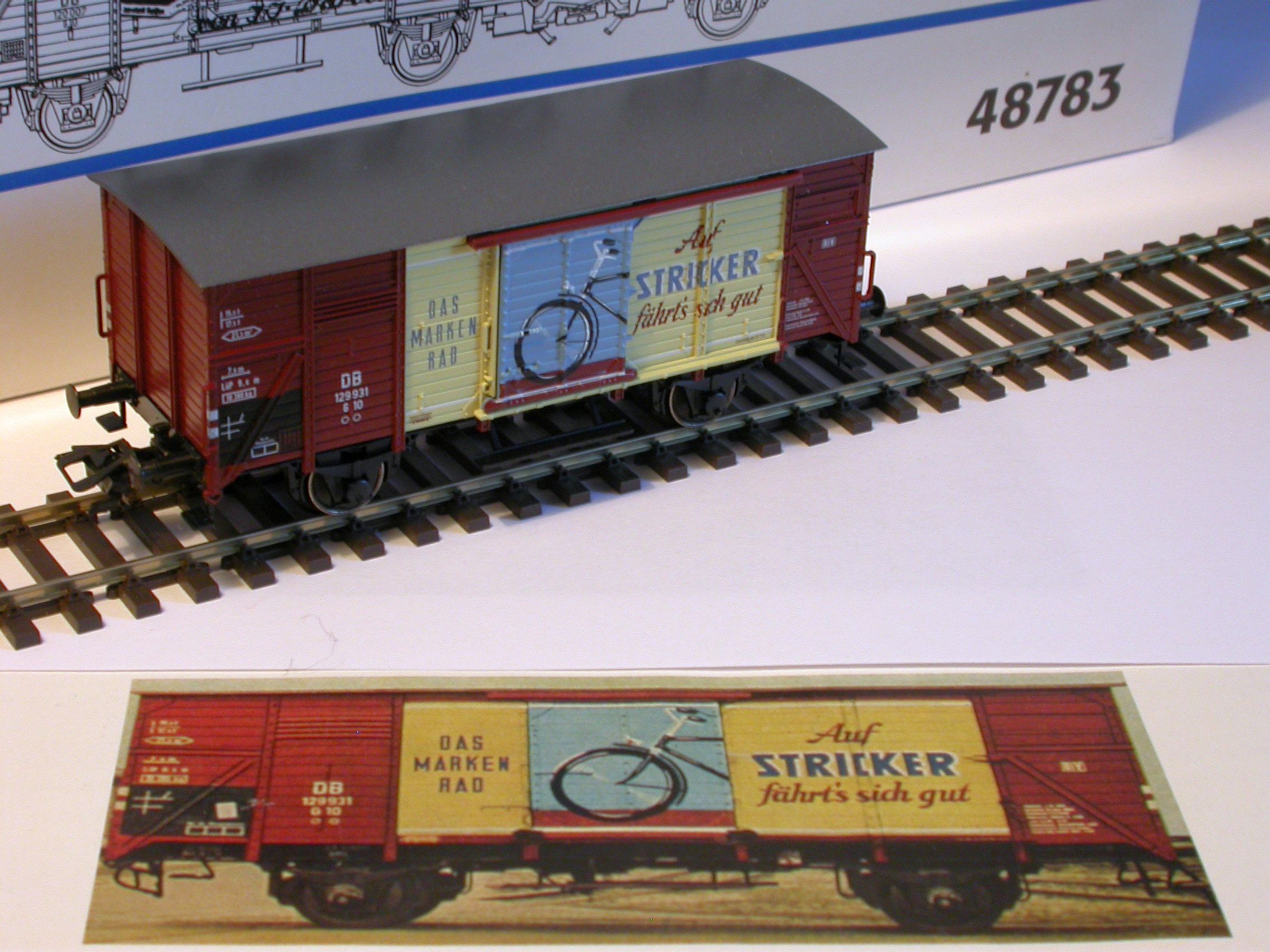 Aber immer dran denken: "Die Abschlüsse auf Werbe-Güterwagen können immer nur auf ein Jahr getätigt werden" -- also beim Altern nicht so stark reinhauen, denn "Für die Erstellung von Werbe-Güterwagen werden ausschließlich fabrikneue G-Wagen herangezogen, sodaß also der Gesamteindruck dieser Wagen an sich dem Beschauer ein wohltuendes Bild vermittelt"! Fabrikneue G 10? "Achwas", um es mit Herrn v. Bülow zu sagen. Aber vollaufgearbeitet werden sie wohl gewesen sein. Und auch stückzahlmäßig ist Zurückhaltung geboten: "Nur 3000 Wagen, d.h. 2 ½ % des G-Wagenbestandes, sind für Werbung freigegeben." Das bedeutet: auf 5 Werbewagen bräuchten wir 195 normale G-Wagen. Naja, auf Großtreffen mag es hinkommen. Jedenfalls: "Im Güterzug nur 2 bis 3 Wagen mit Werbung, daher größter Blickfang und Werbeerfolg."