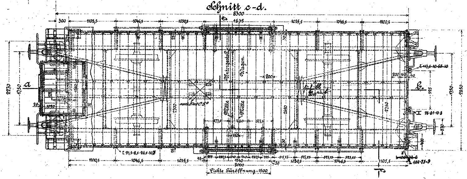 Flüchtig betrachtet, sieht der Handbremswagen auf der Zeichnung des Musterblatts A2 genauso aus! Nanu, wieso das denn? Nun, wer Augen hat zu lesen, der lese. Ganz oben in der Zeichnung: "Schnitt a-b". Wie man aus der Draufsicht (genaugenommen: dem Schnitt c-d) erschließen kann, handelt es sich um die Innenansicht der Seitenwand! Und natürlich sitzen Lade- und Lüftungsöffnung, von innen gesehen, spiegelverkehrt.