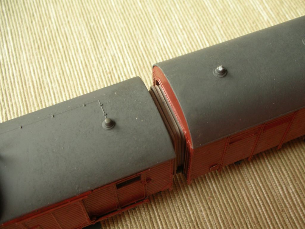 Viel fehlt nicht mehr. Der Faltenbalghalter an der Stirnseite des ehemaligen Gl ist jetzt so spontan das einzige noch nicht besprochene und auch noch nicht montierte Detail, das mir einfällt. Achja, und natürlich der Anlaß für die Nebengattungszeichen "eh", also elektrische und Dampfheizleitungen bzw. ihre Kupplungen an den Wagenenden. Wenn die Sachen montiert sind, werden sie hier natürlich auch gezeigt.