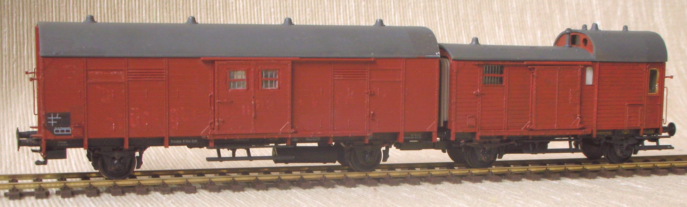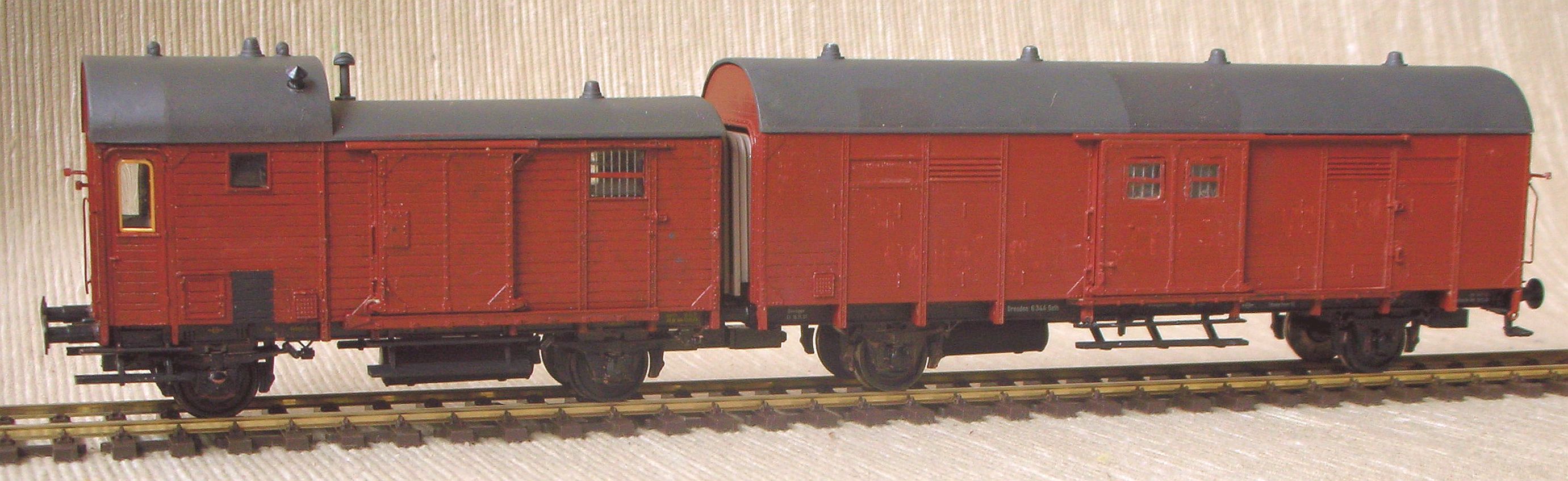Die älteste und sicherlich auch interessanteste Leigeinheit in meiner kleinen Runde ist diese hier, bestehend aus einem preußischen Güterzugbegleitwagen Pwg pr 14 und einem großräumigen gedeckten Wagen der Verbandsbauart Gl Dresden, bei der DB später als Gl 11 geführt. Als Leigwagen hießen die beiden dann natürlich anders: der Pwg wurde zum Gllvweh Dresden (ll: Leigwagen; v: eigentlich Stallungswagen, hier wohl "mit Begleiterabteil" o.ä.; w: weniger als 15 to Ladegewicht; eh: elektrische und Dampfheizleitung), später bei der DB Gllvweh 08, während der Gl zum Glleh Dresden, später Glleh 12, aufstieg.