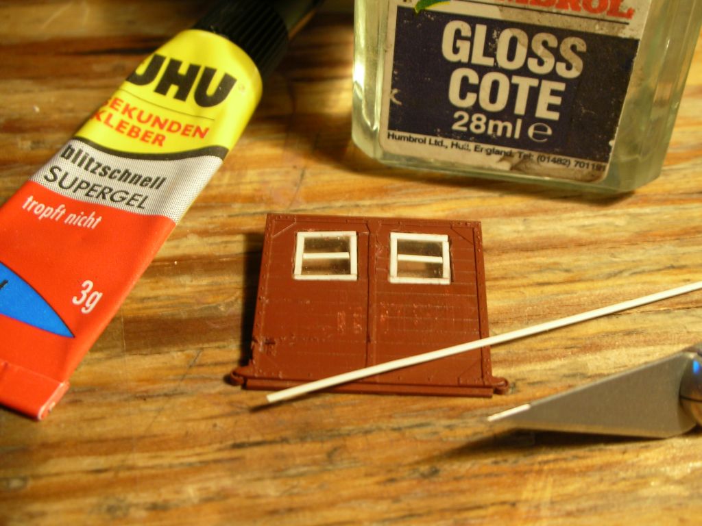 PS-Streifchen mit Sekundenkleber -- bis auf das mittlere, da hab ich die Scheibe mit Humbrol