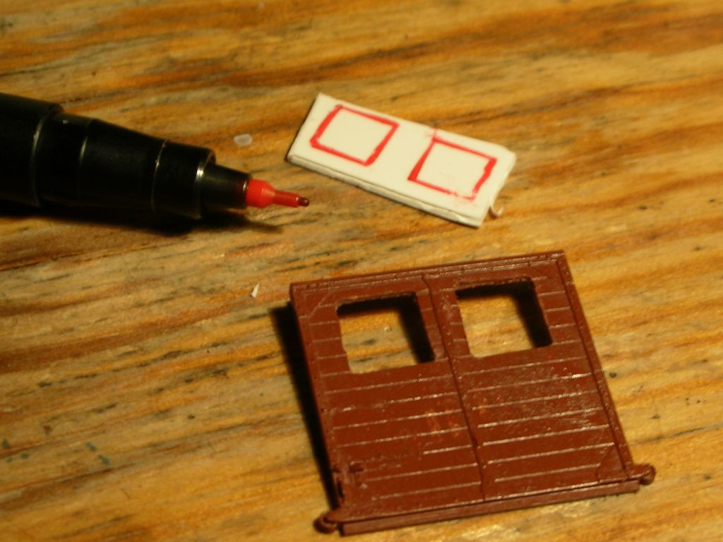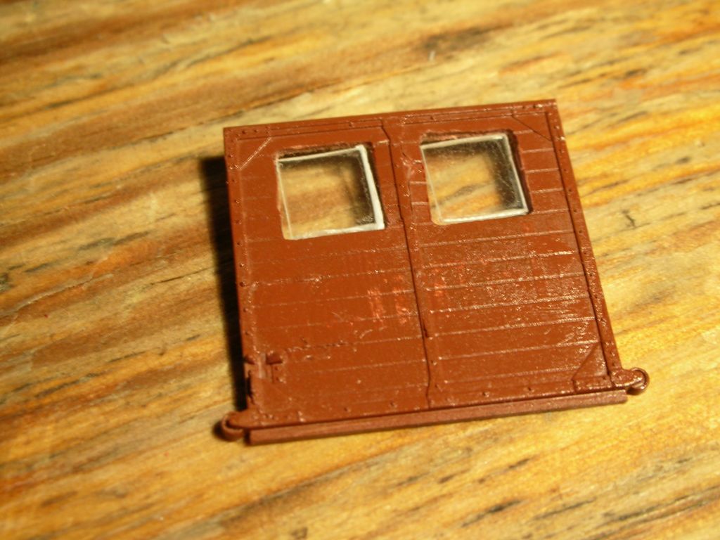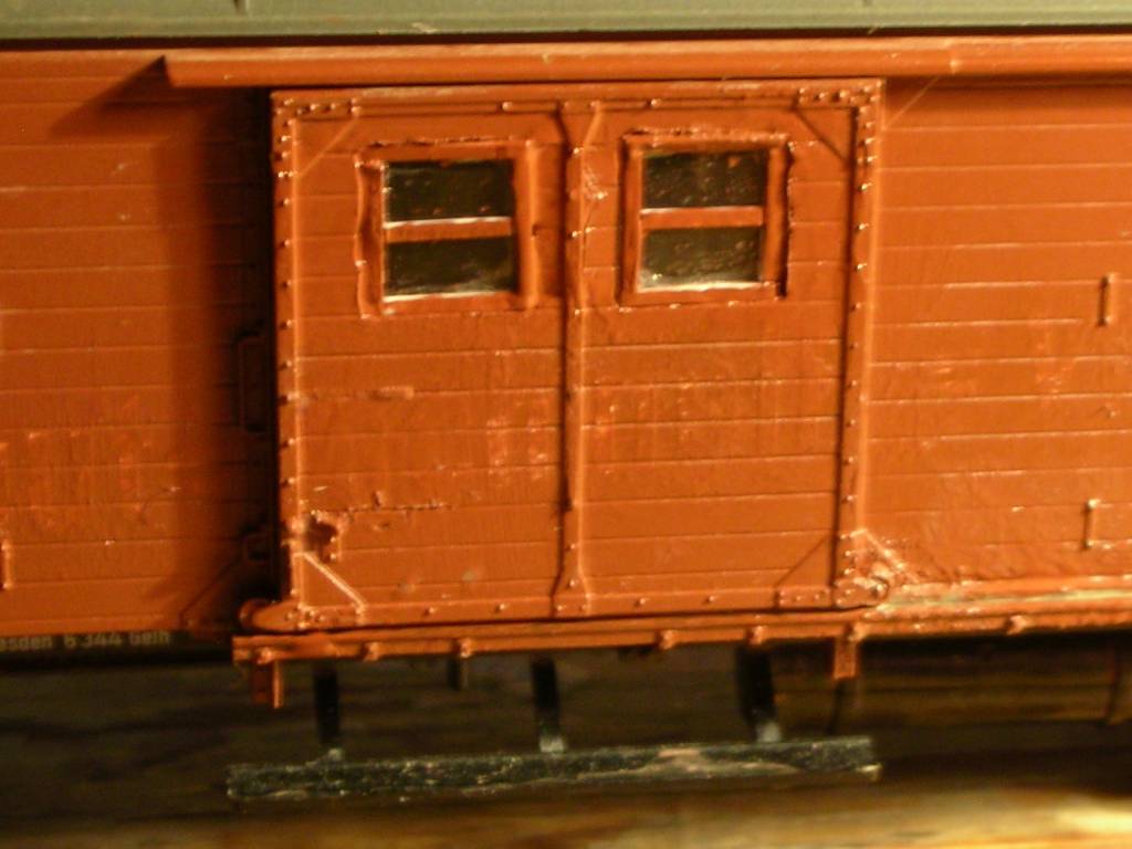 Noch variantenreicher sind die Fenstermöglichkeiten am Gl-Wagen. Da kann man Fenster in den Türen nachrüsten -- entweder zwei beidseits der Mittelstrebe oder auch eins in der Mitte, das dann von der Mittelstrebe geteilt wird -- und/oder an den Stellen, wo der Wagen ursprünglich Ladeöffnungen hat, also im jeweils zweiten Feld von außen. Die müssen auch durchaus nicht an beiden Enden sein -- es gibt ein Vorbildfoto mit Fenstern nur in der Tür und im zweiten Feld am Pwg-abgewandten Ende.