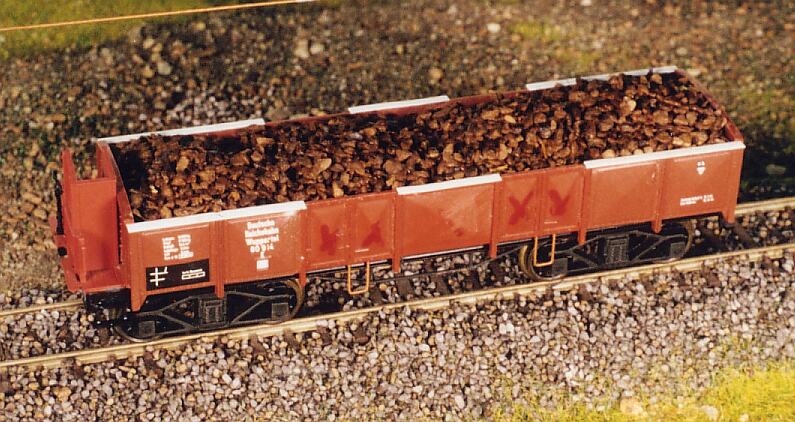 Das Fahrwerk muß m.E. nur nachgebessert werden, der Wagenkasten wird grundiert, da Metallteile dazugekommen sind und die Teile eventuell unterschiedliche Oberflächen haben. Dabei kriegt natürlich die Ladung was ab, aber die wird zuletzt geschwärzt. Die eigentliche Farbgebung erfolgt in RAL 8012.