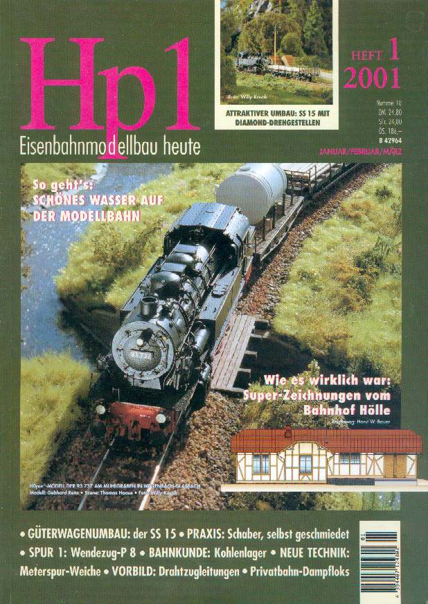 Im Tal der Schwarza ist die Titelgeschichte über den Bau von Flüssen auf der Modellbahn; das EZ-Water von Woodland/Noch spielt eine wesentliche Rolle, aber dies ist keine Produktbesprechung, sondern die beste Anleitung zum Modellgewässerbau, die ich kenne. Dagegen verblaßt der Rest des Heftes unverdient: sowohl der Artikel über den Mittenselbstentlader Ommv 62 und ein damit bestücktes Kohlenlager als auch die Umbauberichte über den Roco-SS 15 und die Wendezug-P 8, letztere in Spur 1, sind nicht minder beeindruckend. Ein Vorbildbericht über Privat- und Nebenbahndampfloks, der Stellwerksartikel über die Drahtzugleitung (mit sehr brauchbaren Fotos und Zeichnungen!) und ein ebenfalls reich illustrierter Artikel über das Empfangsgebäude von Hölle runden das Heft harmonisch ab. Und auch der Artikel über Gleiswaagen, ja selbst die Produktbesprechung des Brawa-UIC-Kühlwagens bieten weit mehr Infos als manch Miba-Titelstory...