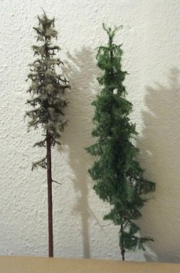 Abb. 2: Die fertige Fichte (links, das mittelgrüne Gras ist bei solche grellem Licht eindeutig zu hell, dunkelgrünes wirkt besser) neben einer mit Silflor-Material benadelten. Der Stamm des rechten Baumes besteht nur aus Draht (kein Rohrstamm).