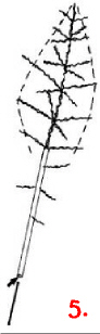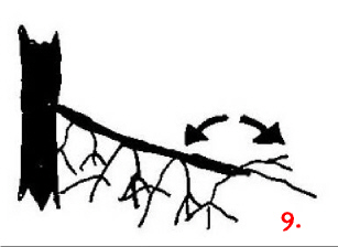 Die grobe Faustregel: Zur Spitze werden die Äste kürzer, weiter unten jedoch auch (gestrichelte Linie in der Zeichnung). Die Äste wachsen vom Stamm aus erst etwas nach unten, die Spitzen der Zweige weisen aber wieder leicht nach oben. Je weiter man zur Spitze kommt, desto mehr ist die Wuchsrichtung nach oben gerichtet.