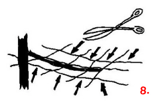Ebenso werden die Verbindungen des Netzes parallel zu unserem Drahtast durchgeschnitten (Pfeile in der Zeichnung).