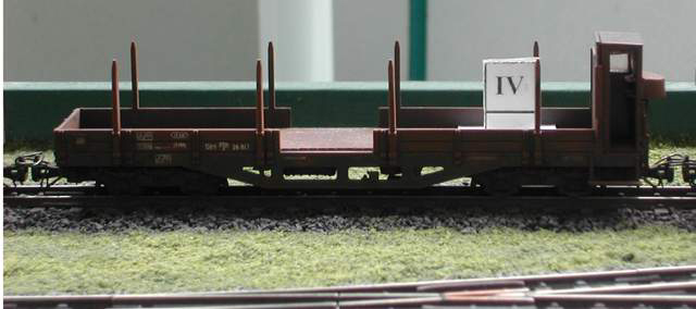 Lok und Wagen stammen aus den Sortimenten der Firmen Bemo und Roco. Die VL21 der St.L.B. (Steiermärkische Landes Bahn) von Bemo passt gut zu den ÖBB – Vierachsern von Roco. Grundmodell ist die V51 der DB. Die Bemo – Lok ist geringfügig kürzer als die Waggons. Das stört hierbei aber weniger als eine Lok, die länger als die Wagen wäre. Die Fahreigenschaften im Digitalbetrieb sind nach entsprechendem Decoderprogrammieren sehr ordentlich und überaus zweckentsprechend. Eine in der Höchstgeschwindigkeit kastrierte Lok verleitet auch nicht zur Raserei, selbst im Kampf um Sekunden gegen die Stoppuhr ist das Fahrbild alles andere als hibbelig zu bezeichnen. Bei den Wagen war es ein Geduldspiel die Kupplungen leichtgängig zu bekommen, wie auch richtig zu justieren. Irgendwie werde ich den Verdacht nicht los, dass Drahtbiegearbeiten nicht wirklich zu meinen Stärken gehören. Jetzt, wo aber alles richtig flutscht, weiß ich, dass sich die Mühe gelohnt hat. Auf dem PC entsteht noch ein Beschilderungssatz mit den römischen Ziffern I-V in doppelter Ausführung. Mit etwas Tesa - Film werden die Schilder auf beide Seiten aller Wagen geklebt. Auch bei optisch gleichen Waggons können wir diese nun klar voneinander unterscheiden.