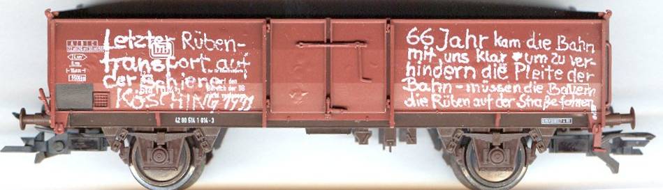 Wer einen oder mehrere der oben abgebildeten Rübenwagen haben will und mir dafür entsprechend viele "normale", also Epoche-3-bis-höchstens-4-beschriftete Wagen geben will, der sei dazu herzlich eingeladen. Wenn diese Wagen nicht original sind, also z.B. gealtert, zugerüstet, umbeschriftet, beschwert, mit festgelegten Kupplungen versehen, beladen, nicht originalverpackt oder sonstwas, dann ist das kein Problem (eher im Gegenteil)! Wer mir partout für einen der Eo 019/E 039/Omm 53 einen Eo 017/E 037/Omm 52 geben will, darf natürlich auch das gerne tun, nicht aber umgekehrt. Und wer die originalen Klein-Modellbahn-Kupplungen braucht oder mir aberwitziges Geld für die M&D-Ladeguteinsätze geben will, soll auch nicht an mir scheitern ;-)