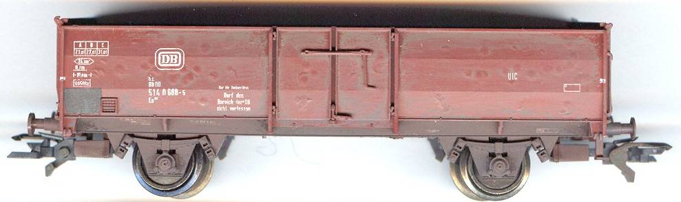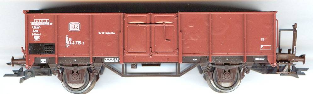 Aber Achtung: Roco-Wagen anbieten ist zwecklos! Und bei Klein Modellbahn gibt's zwei Sorten Untergestelle. Die alten erkennt man an den viel zu weit außen liegenden Achshaltern und dahinterliegenden beweglichen Blindachshaltern; die neuen haben bewegliche, dafür aber schön eng am Rad anliegende Achshalter. Von meinen Wagen haben nur die ersten sechs (die aus dem M&D-Set) neue Achshalter, und die tausche ich nur gegen ebensolche (oder evtl. gegen alte zuzüglich eines angemessenen Obolus'). Das mit dem Obolus funktioniert natürlich ggf. auch umgekehrt, ein paar Euro zahle ich für neue Achshalter im Tausch gegen alte (oder für einen der relativ seltenen Wagenkästen ohne Beulen) gern zu. Ansonsten können wir auch über andere kleine Abweichungen, etwa gebremst vs. ungebremst (ersteres wäre bei mir bevorzugt) oder so, gerne feilschen.