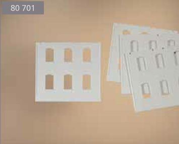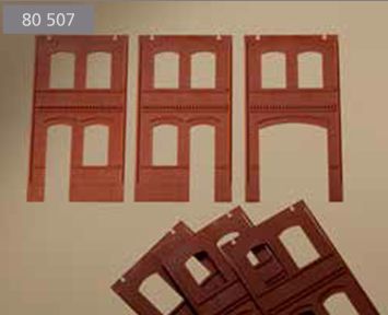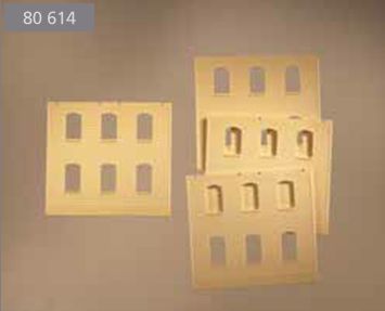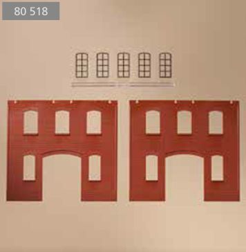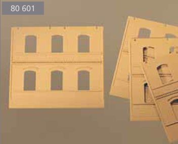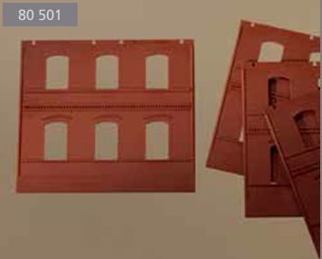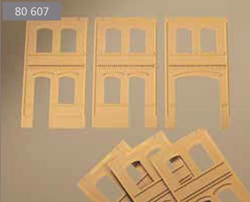Im Gegensatz zu DPM, der Mutter aller Fabrikbaukästen, eignet sich das Auhagensystem (noch) nicht so ohne weiteres zum Aufbau von Gebäuden mit mehr als zwei Stockwerken (wenn wir jetzt mal die großen Industriefenster als zwei Stockwerke rechnen). Bis sich das dereinst hoffentlich mal ändert, kann man die Wandteile aber natürlich auch zersägen und so aufstocken. Das hat sogar Auhagen selber in seiner Planungshilfe so gemacht. Bei genauerem Blick zeigt sich, daß die Wandteile mit 4 Fenstern und Zahnfries 2322A einfach einmal unter dem Zahnfries und einmal in der obersten Ziegelfuge abgesägt wurden. Die Klebefuge, die beim stumpfen Aneinandersetzen der Teile mitunter entsteht, liegt so im Schatten des leicht vorspringenden Zahnfrieses.