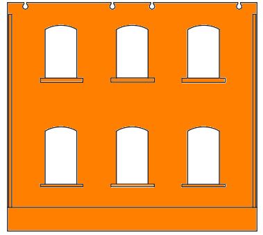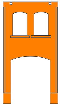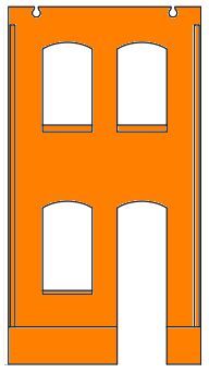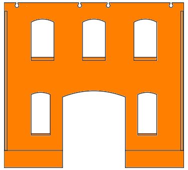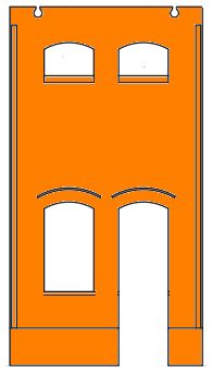 | Unten kleines Tor mittig und 2 schmale Fenster, oben 3 Fenster |