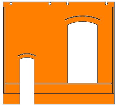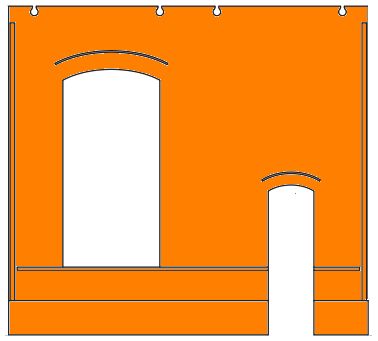 | Auf Rampenhöhe kleines Tor, oben 2 kleine Fenster |