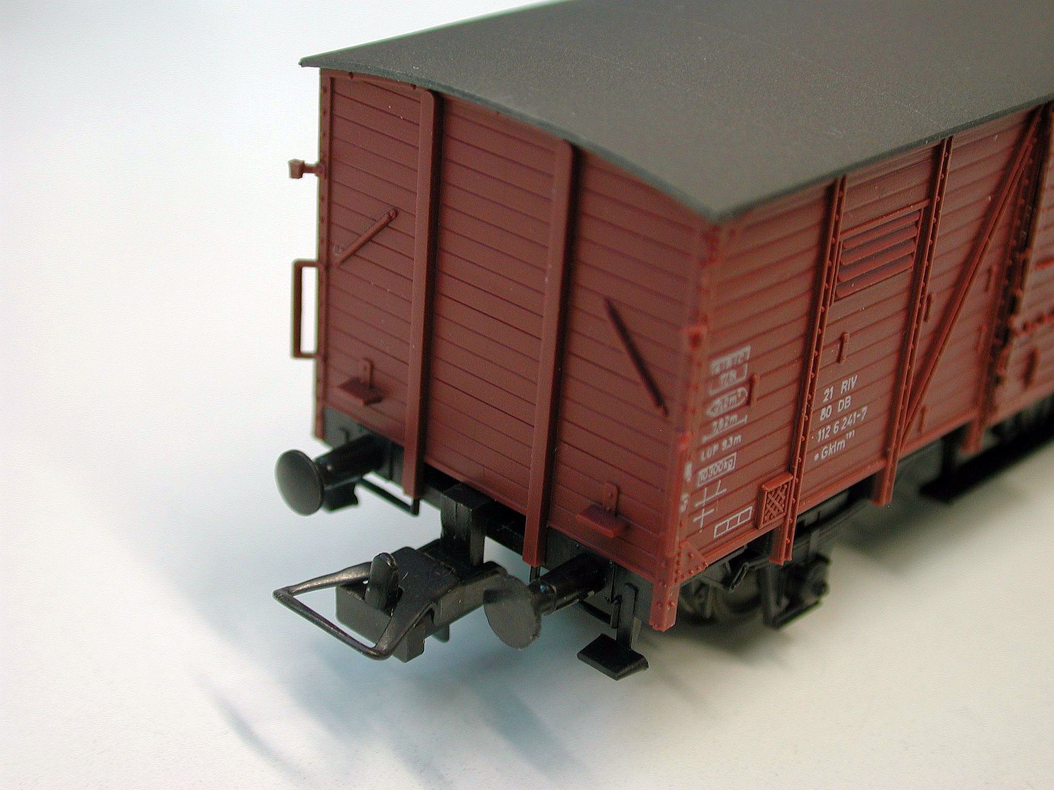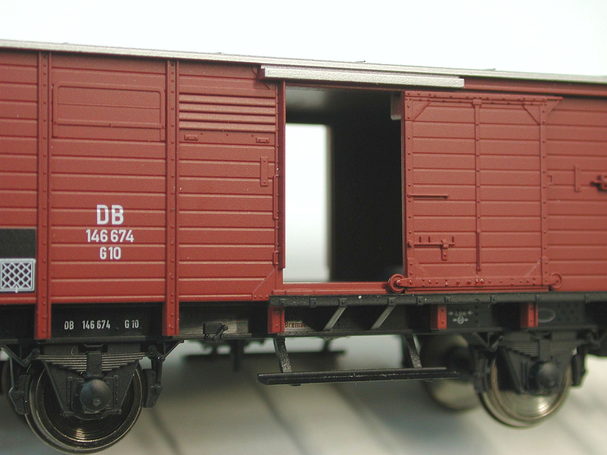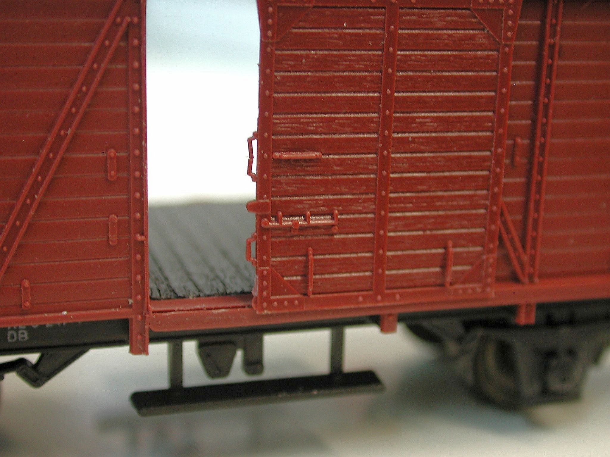 Und als wäre das nicht schon geil genug, sind auch noch die Schiebetürgriffe freistehend angespritzt. Und hinter der offenen Schiebetür hat der Röwa-Wagen auch einen Wagenboden auf der richtigen Höhe, ohne die störende Türschwelle wie oben bei Fleischmann oder -- noch ausgeprägter -- bei Märklin.