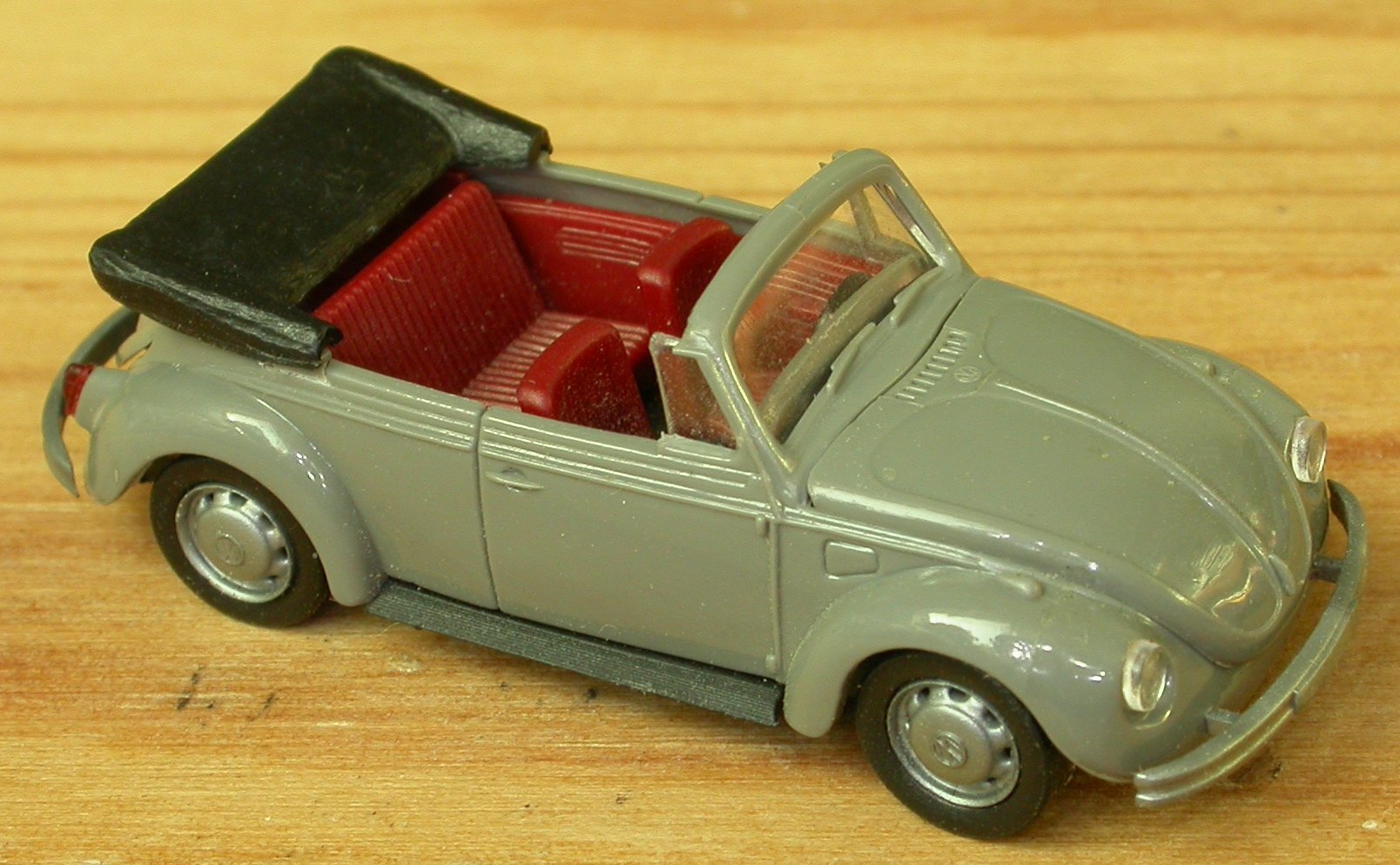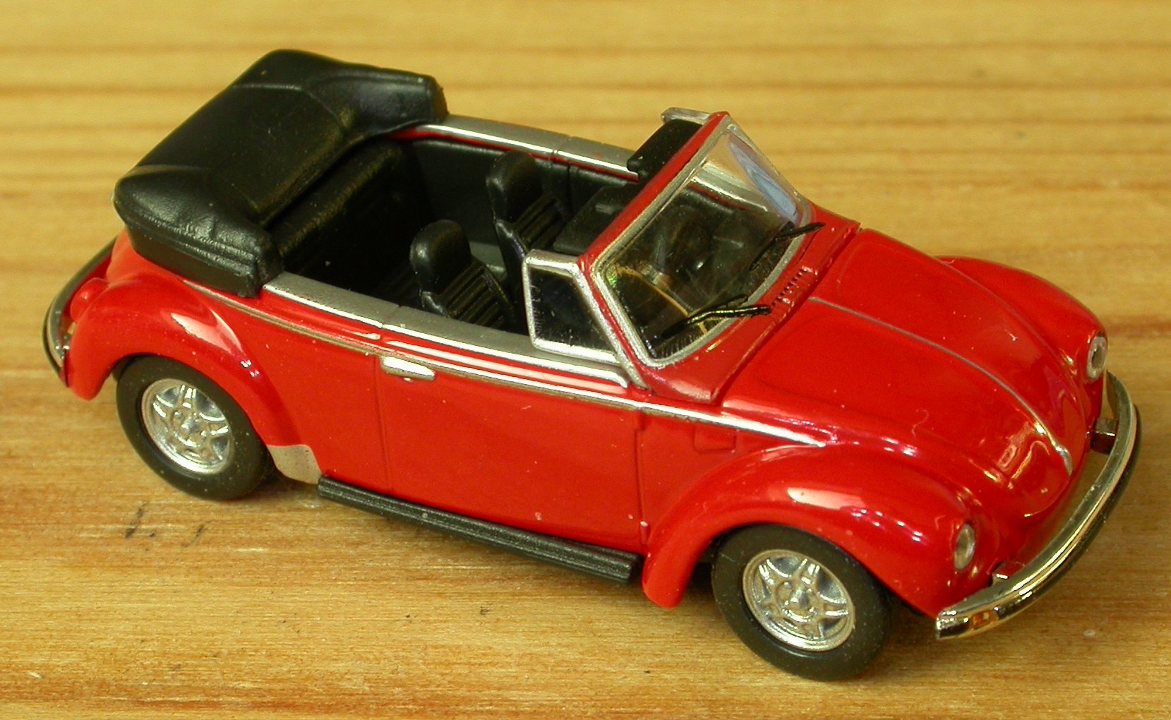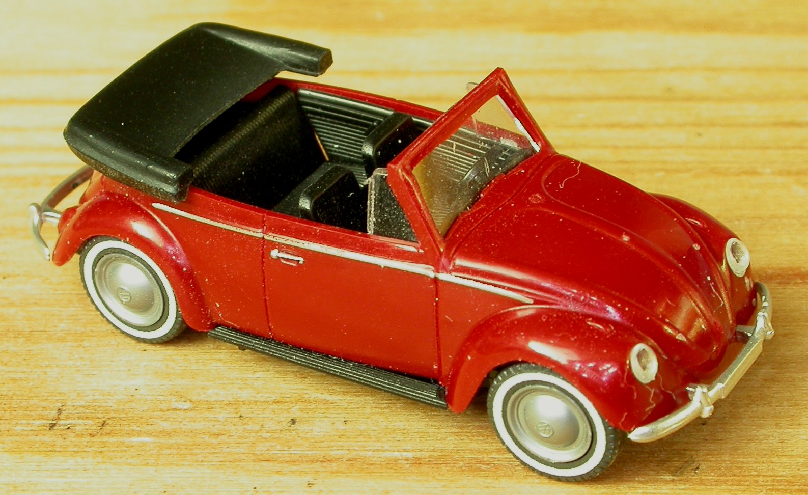 Hoppla! Wer wie ich einen weiteren Schuco-Käfer (s.u.) erwartet hatte, als dieses Cabrio angekündigt wurde, sieht sich positiv überrascht: so schlecht ist der gar nicht. Klar sind die Gravuren nicht ganz so fein wie bei der Kunststoff-Konkurrenz, klar ist die Karosserie vom Material her arg dick, was man besonders an der Oberkante der Türen und Seitenteile des offenen Cabrios gut sieht; aber die Proportionen stimmen, die schwierige gewölbte Frontscheibe sitzt perfekt (Kunststück: sie ist samt Rahmen, Ausstellfenstern, Sonnenblenden (!) und dem Blech bis zur Kofferraumhaubenfuge aus Kunststoff gespritzt, sauber schablonenlackiert und bedruckt und eingesetzt!), die (für späte Baujahre typischen) ATS-Alufelgen sind sehr schön graviert, und die Bedruckung ist bis auf die Rückleuchten beeindruckend sauber und vollständig. Und das alles zu einem Preis, zu dem Brekina einem allenfalls ein völlig unbedrucktes "Economy-Modell" verkauft und Wiking höchstens höflich hustet. Fazit: Das Modell ist schon nicht schlecht, aber das Preis-Leistungs-Verhältnis ist fantastisch. Als nächstes dann bitte eine ältere Limousine oder einen Mexicokäfer in dieser Qualität zu diesem Preis! ;-)