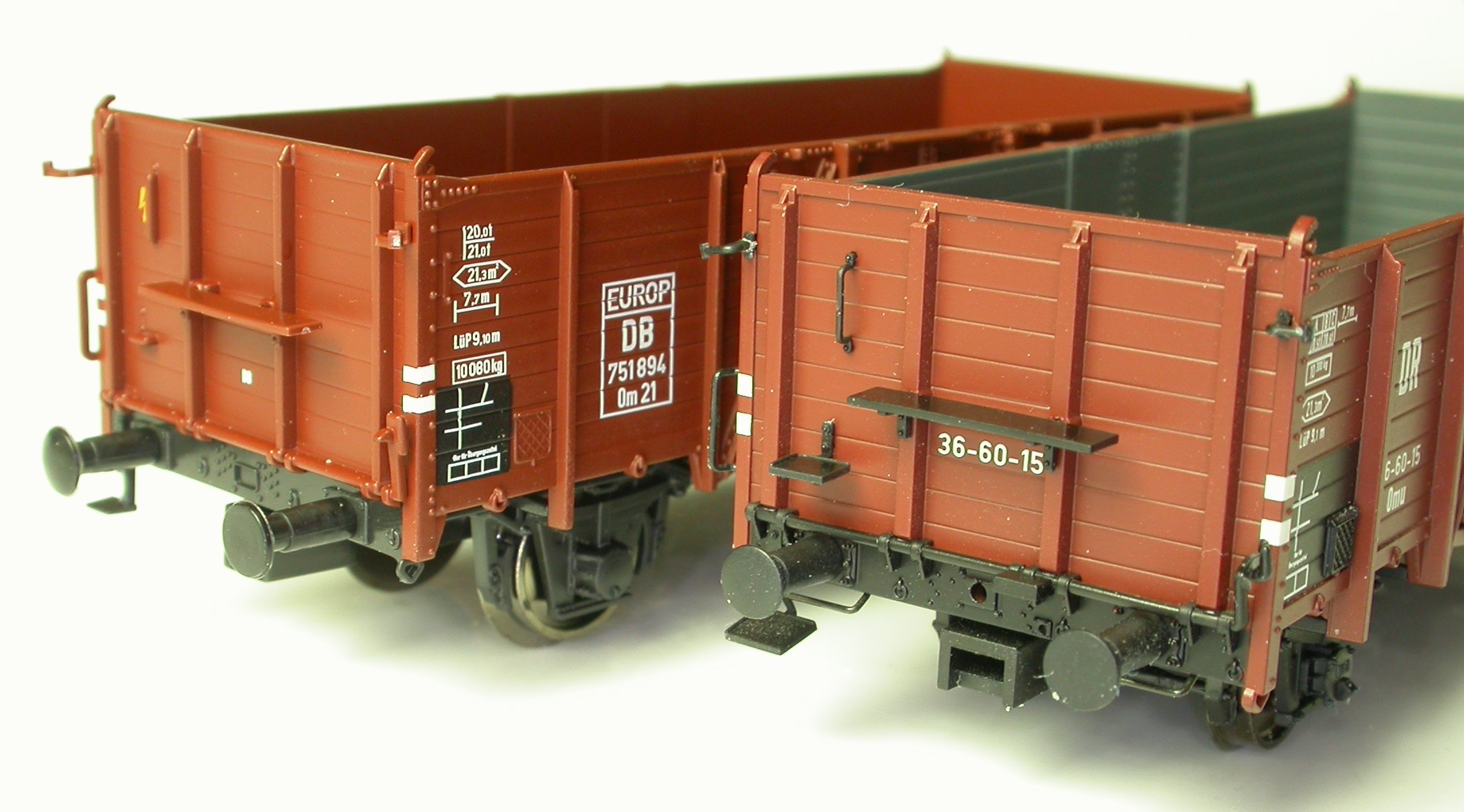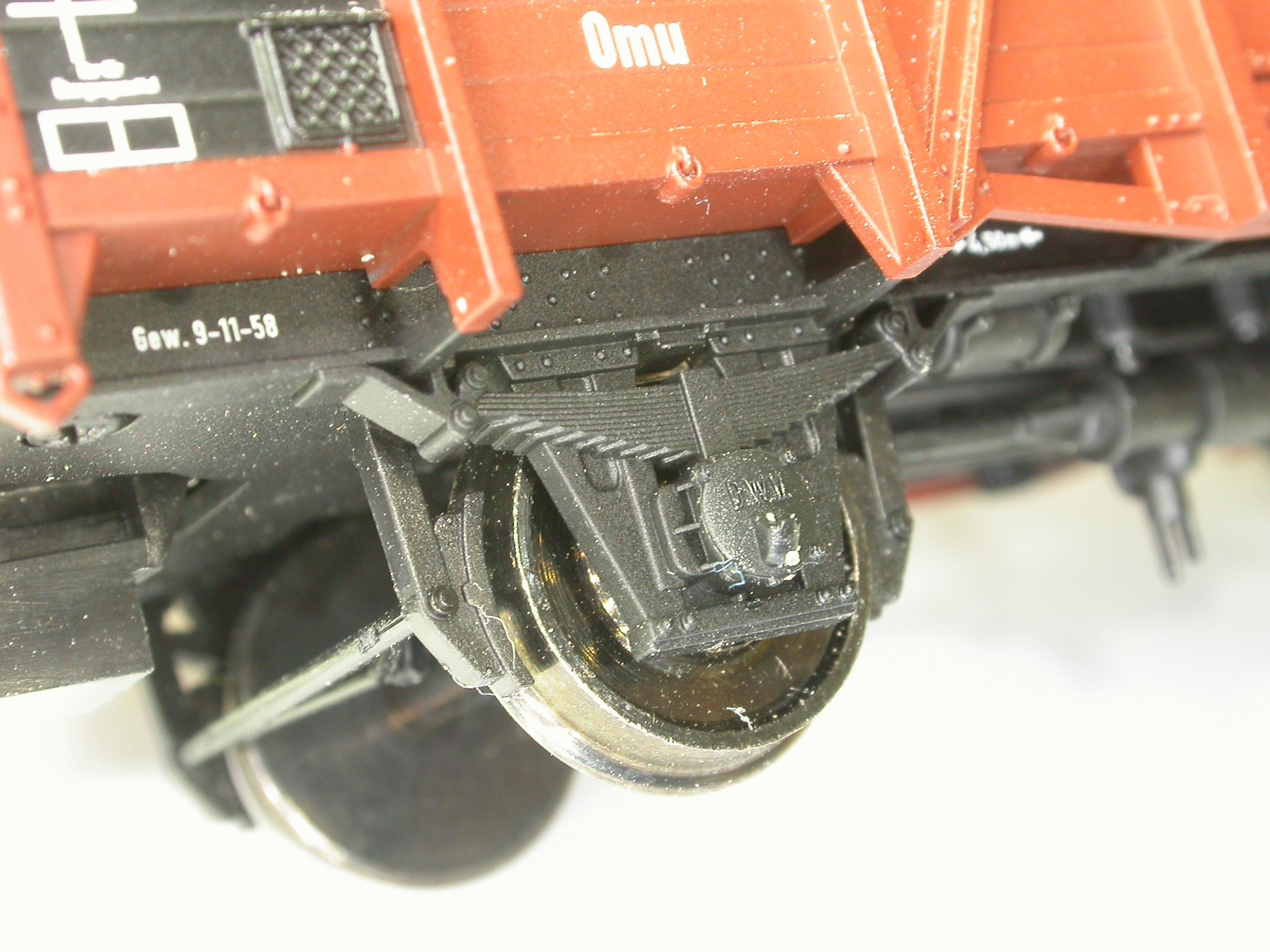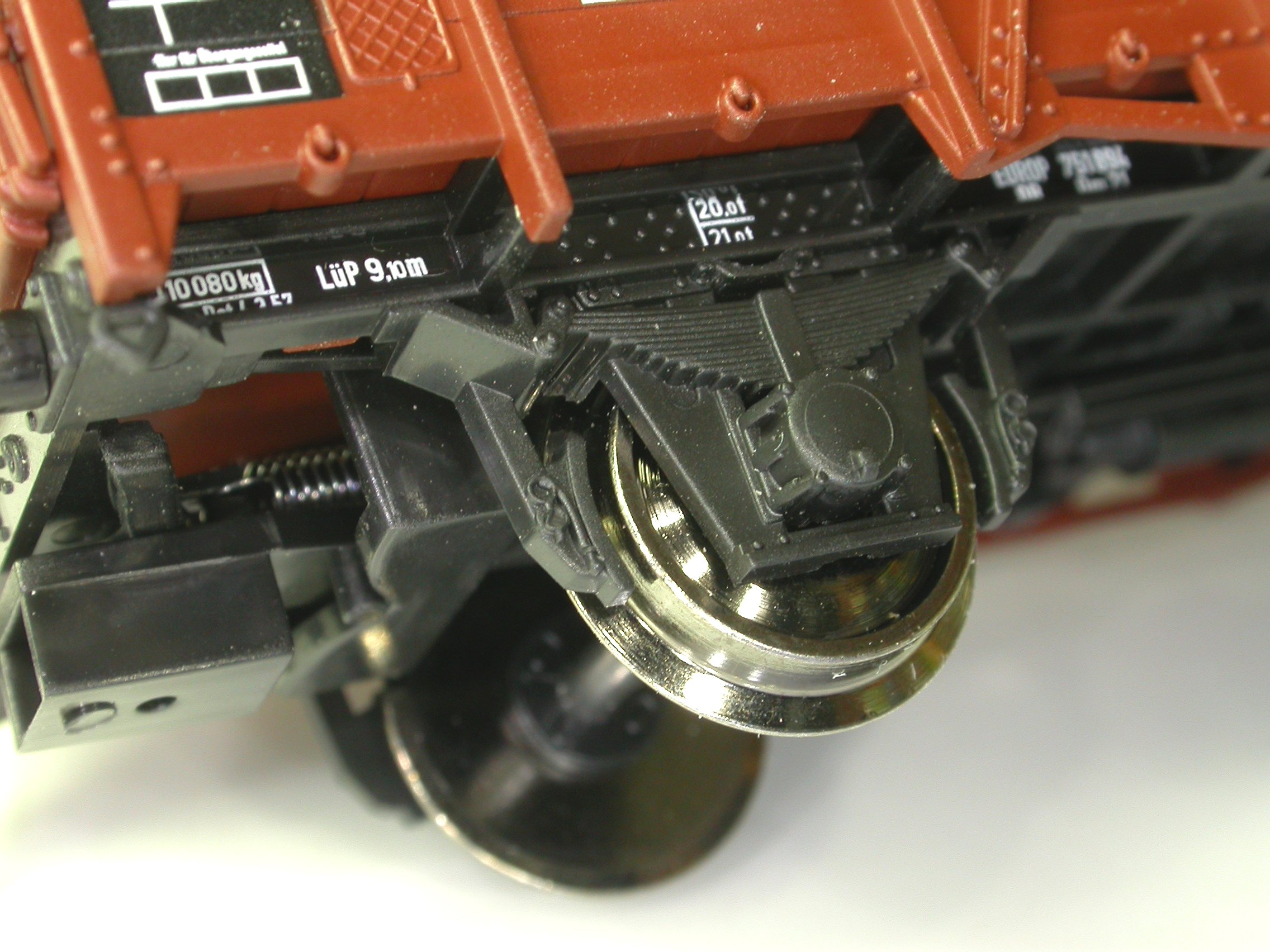 Denn die Modelle sind, man verzeihe mir das vorweggenommene Fazit, schon ziemlich klasse. Klar, ganz erreichen sie nicht das Niveau des Brawa-Modells: manch Tritt ist, da angespritzt, zu zierlich, die Kniehebelwellen und manch Griff dafür aus demselben Grund etwas klobiger geraten. Die Griffe unter den Puffern, die Bremsdreiecke und die Bremshebelwelle fehlen gleich ganz, aber dafür sind die Bremsumstellhebel bedruckt (!), und das Bremsgestänge reicht im Gegensatz zu Brawa bis zu beiden Achsen. Die Kastenstützen sind ebenfalls durchbrochen, die Kastenrungen etwas weniger wuchtig als bei Brawa und die Bretterfugen vergleichbar schmal, aber nicht schmal genug. Und für die natürlich fehlende Gravur der Wagenkasteninnenseite mögen die Achshalter entschädigen, die, man staune und betrachte Bild 5, sogar schmaler ausgefallen sind als Brawa seine!
