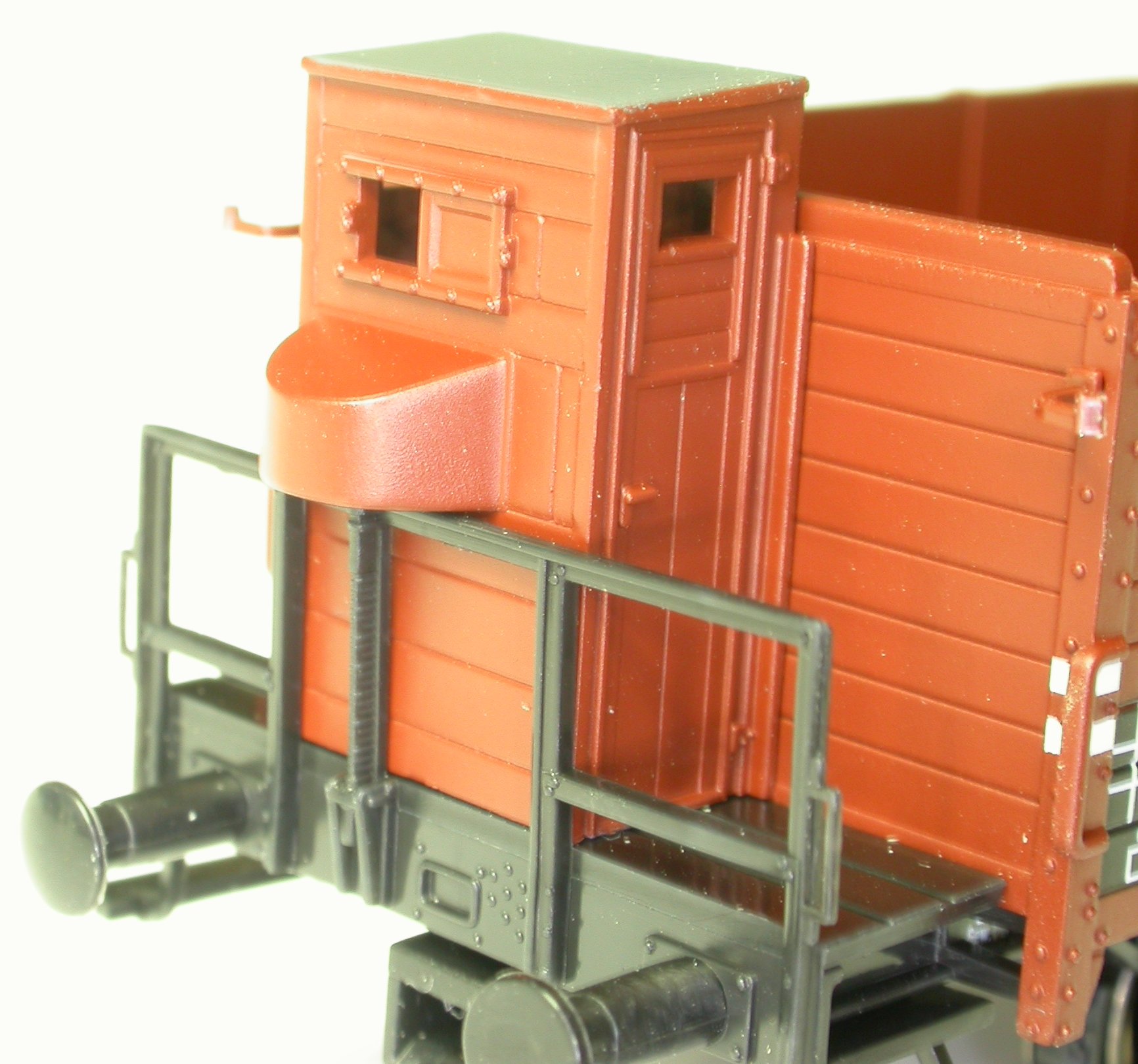 Das Bremserhaus des Roco-Modells ist, wie das nebenstehende Bild 6 zeigt, ebenfalls ausgesprochen gut gelungen. Und mehr noch: unter dem Kurbelkasten findet sich eine Bremskurbel, so daß sich ein Umbau auf Bremserbühne darauf beschränkt, das Bremserhaus wegzuruppen und die Klipsaufnahmen an der Stirnwand einzuebnen, um dort dann mit zwei PS-Profilchen die ehemaligen hinteren Eckprofile des Bremserhauses, die nun als Kastenrungen dienen, darzustellen. Für diese durchdachte Konstruktion gebührt Roco ein Extra-Lob! Und für das abfallende Bremserhaus findet sich bestimmt eine Bühne auf einem anderen Austauschbau-Wagen ... ;-)